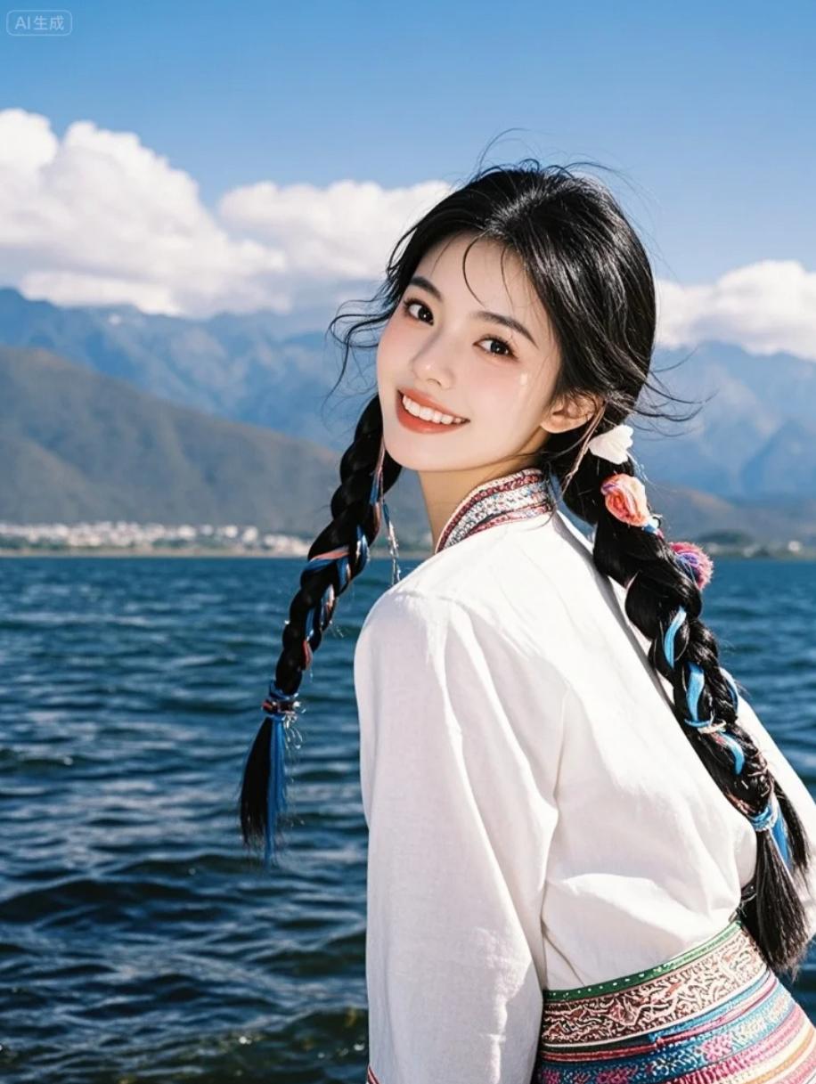 少女将一束彩色麻花辫甩向湖面:“看,我把彩虹丢进水里啦!”