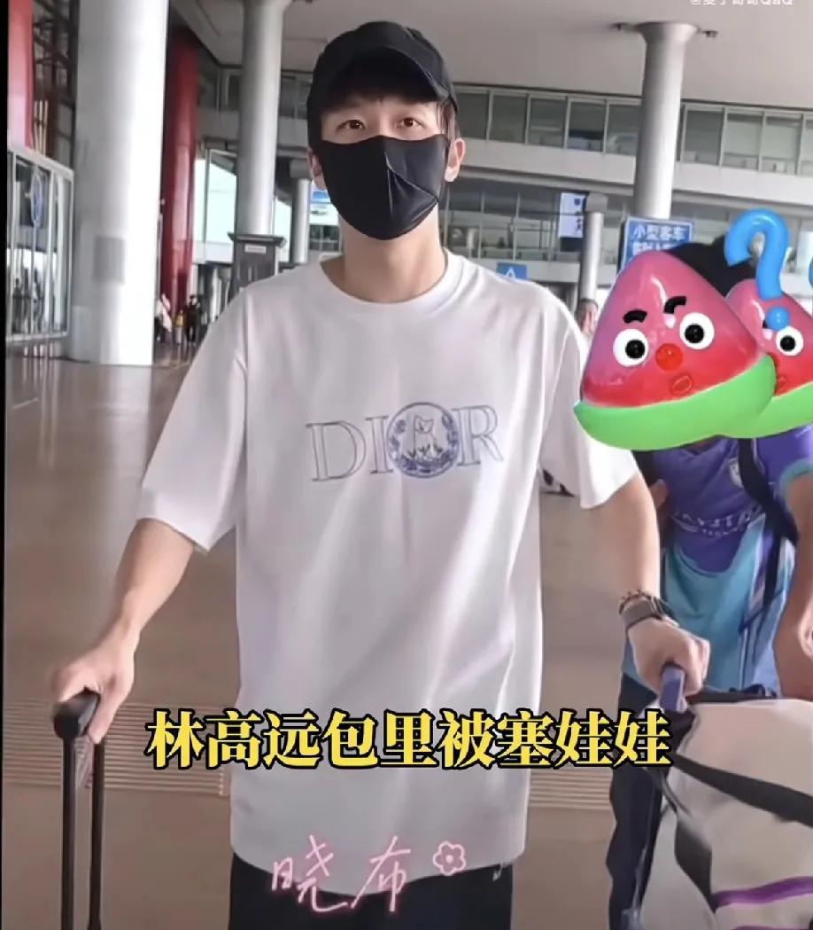08月26日,林高远在机场时,被粉丝偷偷把玩偶放在袋子里,而林高远完全不知道后面