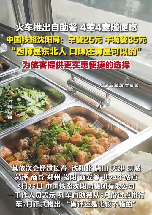 建议全国推广!男子乘坐火车,准备去打点热水泡面吃,谁知路过餐车时却发现里面竟然有自助餐,不仅量大管饱关键价格还不高,此事意外走红后,铁路回应:厨师是东北人,口味还可以。 火车上的用餐体验长期以来都让人难以接受。传统盒饭价格偏高,口味也通常普通。许多长途旅客宁愿自带泡面、面包等简餐,他们利用火车上的热水简单解决用餐,就是为了避免购买车上昂贵的盒饭。 于是这种不满正催生服务模式的转变。一些列车近期开始大胆尝试,K128/125次列车(长春至西安线路)进行了一项大胆尝试。该列车将餐车直接改造为“自助餐厅”。 午餐和晚餐的自助餐价格为35元/位。而早餐的自助餐价格则设定为25元/位,提供了多样化的选择,自助餐设在列车的7号车厢。该车厢位于硬座和卧铺车厢之间,地理位置十分便利。 餐食提供四荤四素的菜品选择,米饭可以无限量供应。旅客可以自主选择菜品,自己打饭,自助餐的目标是让旅客吃饱为止,而且餐食的口味普遍被评价为不错或相当不错。 铁路公司表示,菜单会定期更换。由于列车始发地是东北,菜品带有东北特色,东北菜的特点是实在、分量足,量大又实惠。厨师也是东北人,确保了地道口味。 公众对K128/125次自助餐反响积极。有网友表示高度认可,希望能普遍推广,部分网友认为35元的价格不算便宜。但在交通封闭、选择有限的列车环境下,这份自助餐并不夸张,能吃到现做、热乎、多样化的自助餐,性价比已经比许多景区和机场的餐饮要高了。 这种创新模式并非孤例。中国铁路沈阳局集团有限公司也在不少“银发”旅游列车上供应自助餐,这些旅游列车上的自助餐同样大受欢迎。它们从沈阳、大连、长春等地开往深圳、成都、九江等热门旅游城市。 旅游列车自助餐菜品样式多、品类全。菜品既有东北特色,如熘肉段、锅包肉,也有地道川菜,如水煮鱼、宫保鸡丁。旅游列车自助餐每天的菜品都不同,旨在带来新惊喜,考虑到老年旅客的健康需求,车上特意提供低糖、低油、低盐、清淡易消化的餐食。 如果旅客在行程中过生日,当天还能免费吃上一碗长寿面。这项服务被评价为非常贴心,此举最大的意义在于铁路部门服务态度的转变。铁路部门开始愿意为提升乘客体验做出调整。 这种转变值得肯定。火车自助餐的出现,标志着铁路服务的一次大胆创新,它打破了传统列车餐饮的局限,为旅客提供了更多选择和更好的用餐体验,这体现了铁路部门对旅客需求的关注,也展现了提升服务质量的决心。期望这种自助餐模式能在更多线路推广。 即使不同线路菜色和价位有差异,也能让旅途更舒心。希望未来能有更多列车推出这样的服务,让大家的旅途更加美好。 对此,你怎么看?