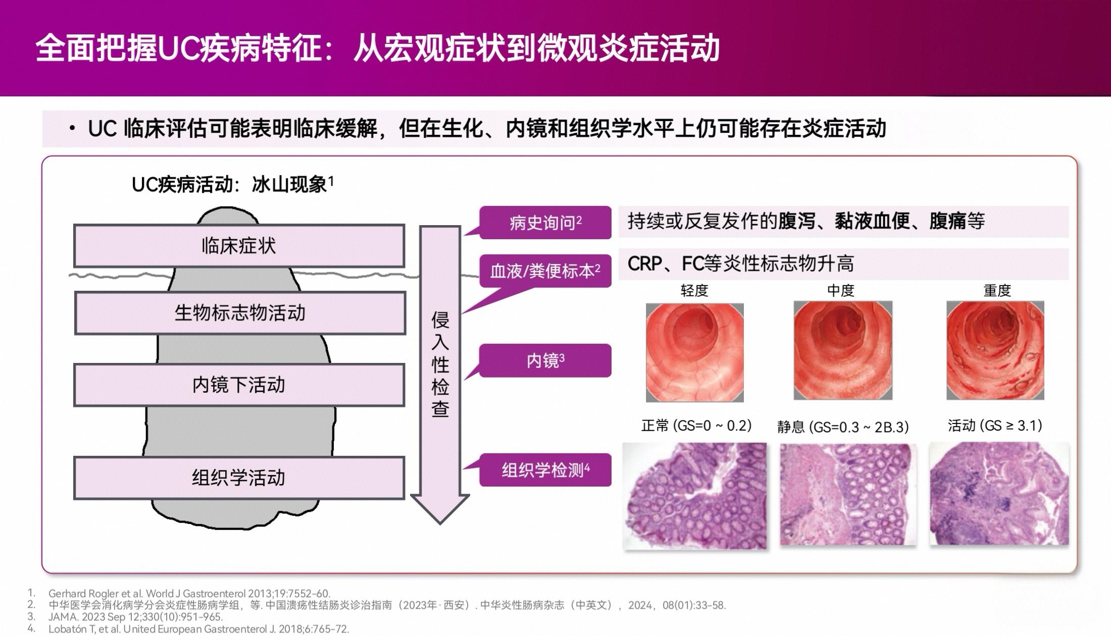 溃疡性结肠炎需要关注什么?1.关注肠镜的愈合,关注病情控制不佳(自己觉得有效,实际一直肠镜活动)导致的病情加重,肠道狭窄,肠道癌变,手术切除。 2.关注什么叫做“冰山理论”,临床症状是大家看得到的,但是血液,粪便指标,肠镜愈合,病理愈合(后面几个都是医生看得到,病人看不到,也不明白),所以要患者教育,搞明白,什么治疗,才是真正可以达到缓解期的治疗,而不是人云亦云。