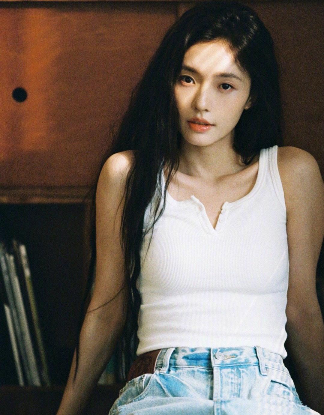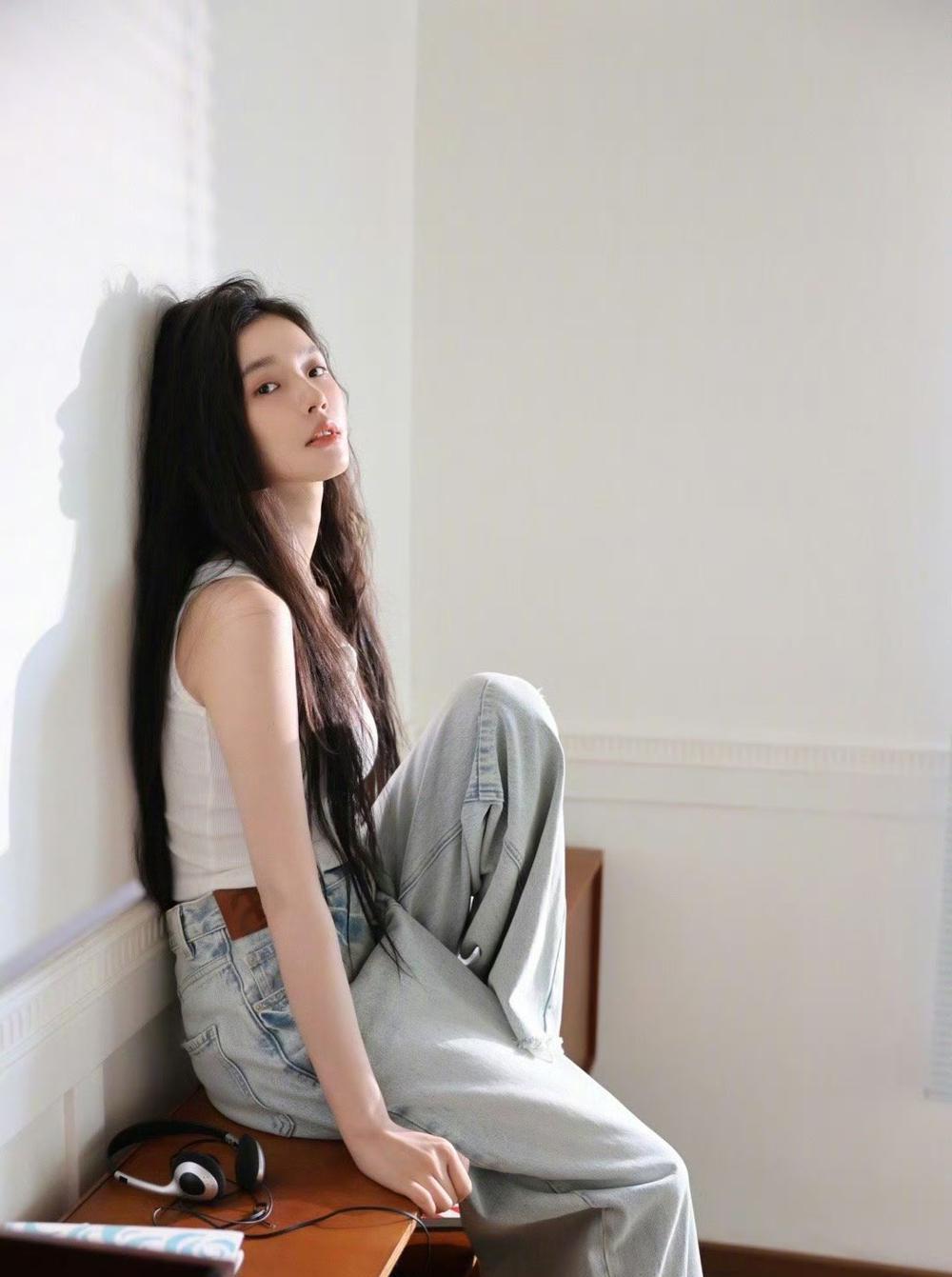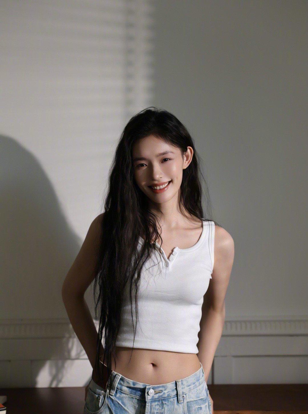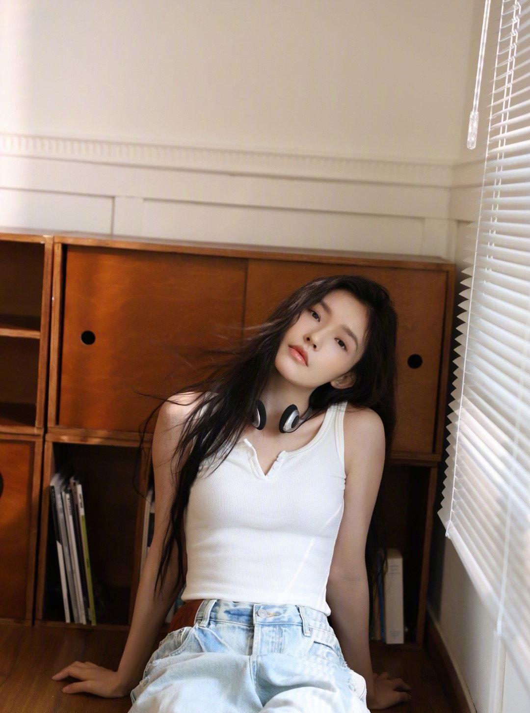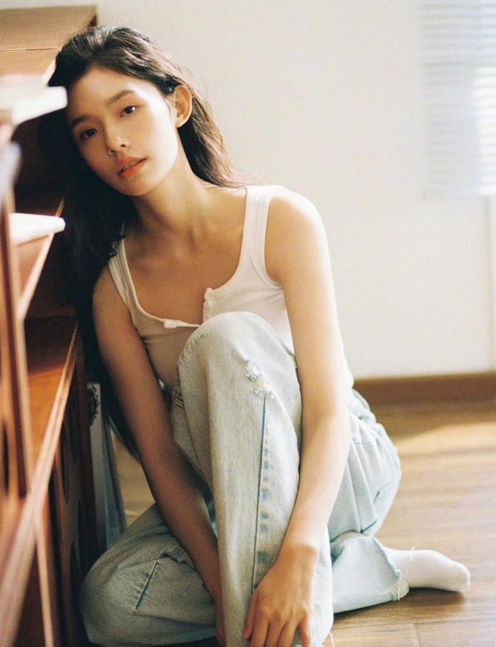 林允简简单单的白背心+牛仔裤,扑面而来的少女感。
