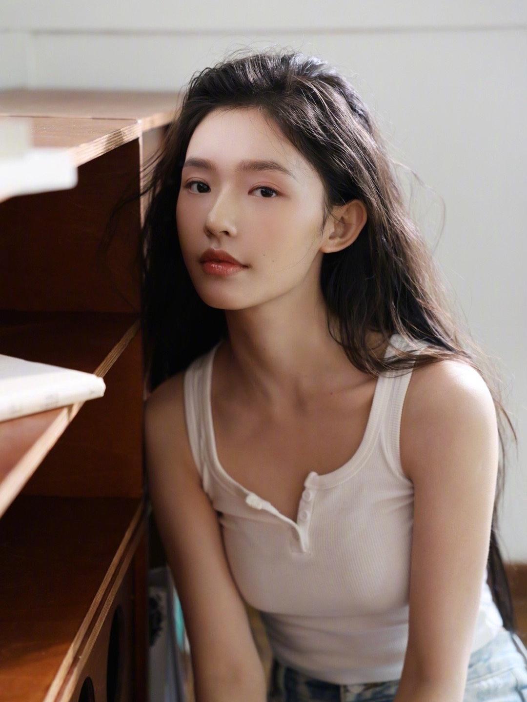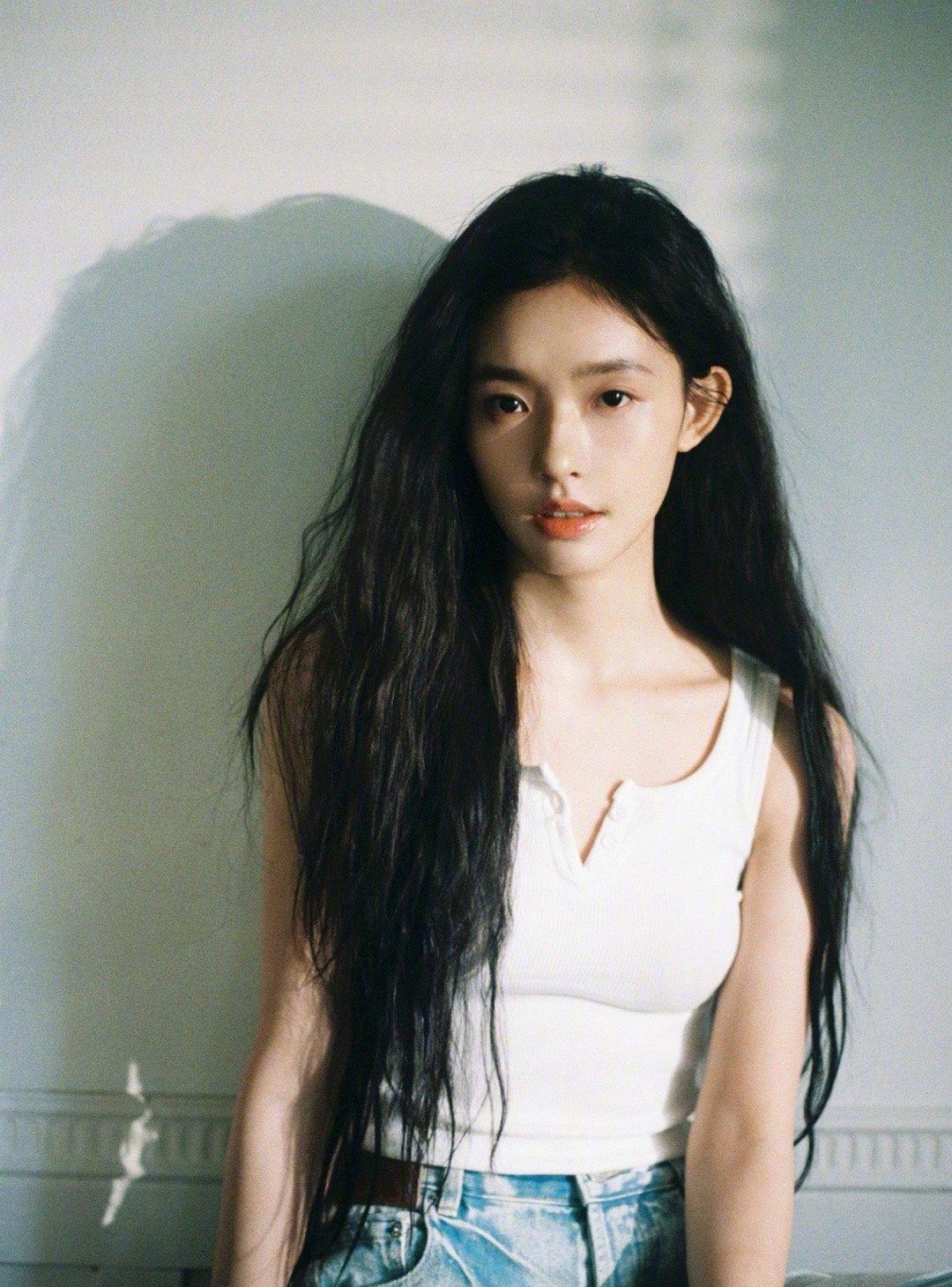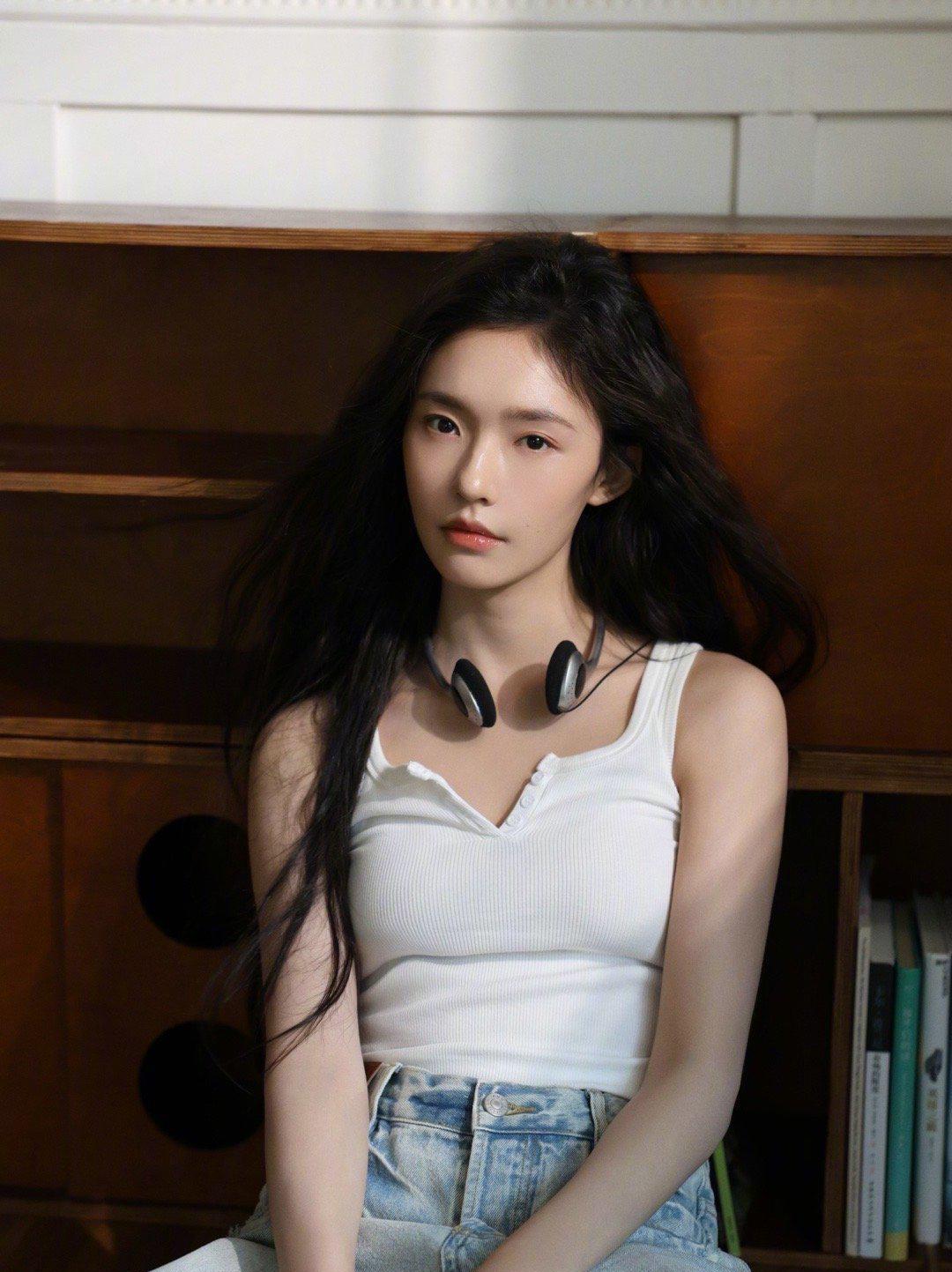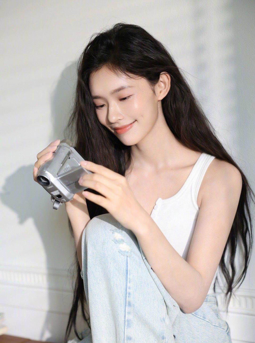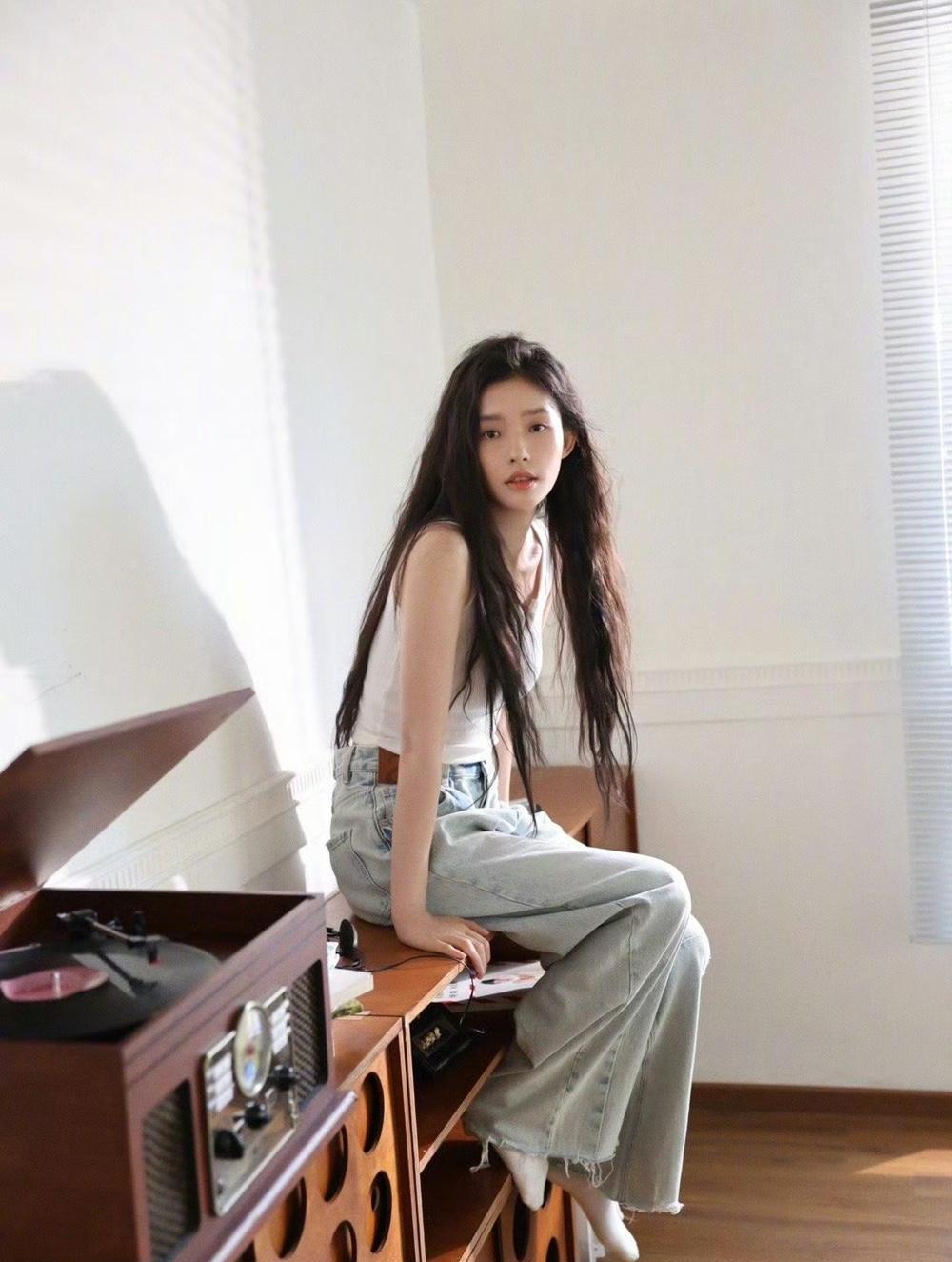 林允简简单单的白背心+牛仔裤,扑面而来的少女感。