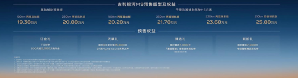 吉利银河M9又走银河老套路! 2025年8月23日,吉利银河M9从宣传到预售预热了快一年了吧,结果拉了坨大的。从银河E8上市那会车展就预热银河全尺寸SUV,结果就预热了个这? 吉利你们要不要看看自己出了个啥?除了长宽高,轴距,前双叉臂,后多连杆这些底子的东西。其他的呢?这么说吧,除了四驱和两驱230顶配,其他配置都是垃圾。就前面那几个配置敢定价19.38-21.78?你要不要看看20万级别市场,哪个座椅不带通风加热按摩,哪个不带二排娱乐屏,哪个没有冰箱。其他品牌座椅甚至可以说恨不得三排都有通风加热按摩。而吉利厉害了,基本都不带。别人二排三排是卧铺,银河搞个硬座。硬座还要着卧铺的钱?两个续航100两驱版本我都不好意思说,这么大的SUV你配个18度电池,真就是为了发动车吧,基本冬天打个折,你就是个油车吧?都说18度电池的版本是个打价格基本不会卖的配置。我看这价格根本不是为了吸引眼球,而是真打算卖吧。现在的电池成本也不如以前那么高了,小米用宁德时代电池,90度电池的车也不过25个吧?银河呢?18度你要20个,40度电池你要25个?你别说你是什么插电混,有发动机你也不会飞,纯电本身成本更高。 最后,我想说吉利银河真的别玩这套,自己去看看市场,你们预热预售个什么?搞笑么?为什么说又走老套路?去年的银河E8也是这么个德行,又宣传又预热,最后呢?我就问你去年的定价,卖出去几台车?银河E8 一年了吧,我就问你出过多少个版本,改过多少次价格?又如何,有销量么?有吧但不多,就M9这价格,把消费者当傻子?自己玩去吧。