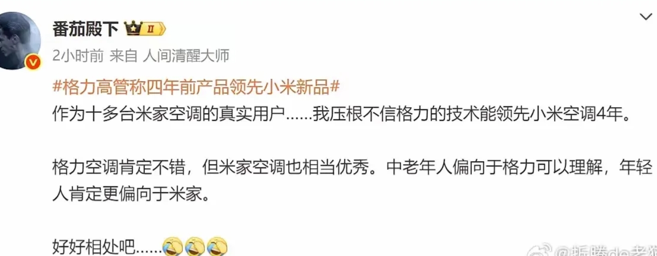 格力不行啊,被这家公司打懵了! 格力高管现在扎心不已,因为在他们的空调行业,闯进了一家世界500强,这家企业打法凶悍,主打就是一个量大,便宜。用以前造手机的手段来打造空调,用以前营销手机的手段来营销空调,动辄自研一整套核心技术,动辄转发一些来历不明号称权威机构公布的数据,给网友看到的就是市场占有率增速遥遥领先,核心技术自研一条龙,格力哪见过这种套路。 格力真的被打趴了吗?怎么自己没感觉?查了一查数据,有影响,但影响不大。 再仔细一看,原来被友商koc拉踩。 原来友商的套路是拿格力10年前的产品和它现在的产品进行对比,显示他现在的产品技术水平高太多。 友商高管是网络红人,利用在网络上的流量优势,向广大网友宣传自己的产品卖得如何的好。格力高管请教了专家才知道他们搞的是这种套路,用转发来表达观点,就算内容是错误的,在被质疑的时候也可以撇清关系,一删就完事。但是宣传的效果它达到了。 格力不得不穷追猛打,进行澄清,但已经是满头包。 京东的强哥曾经说过,比营销是比不过500强的。 500强真是凶残啊,到哪个行业哪个行业就腥风血雨。 那么问题来了,在将来你还看好格力在空调行业的领袖地位吗?