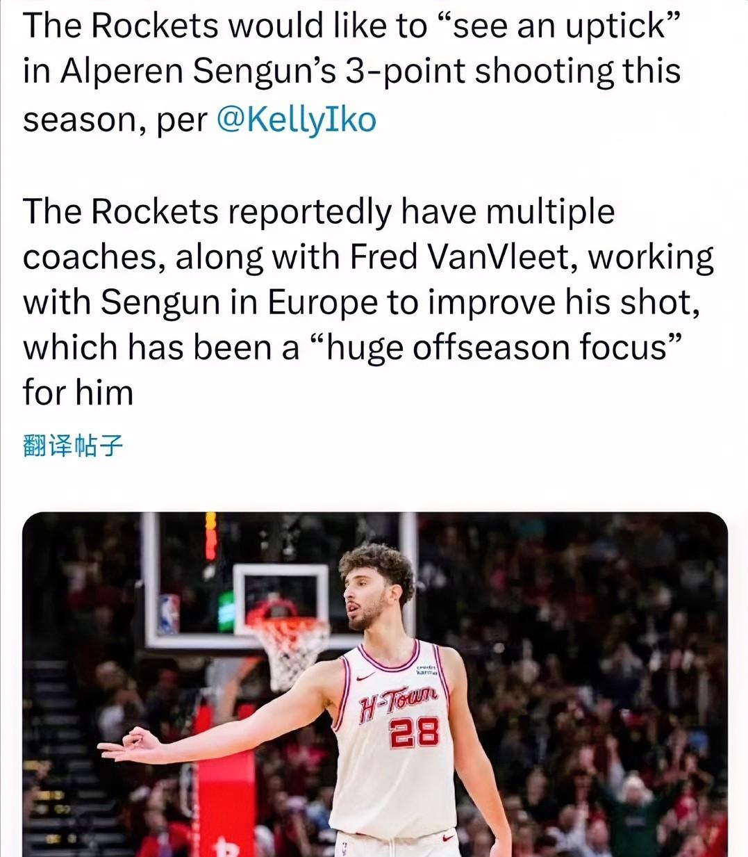 火箭希望申京能够提高三分球命中率! 据NBA记者KellyIko报道,火箭期望