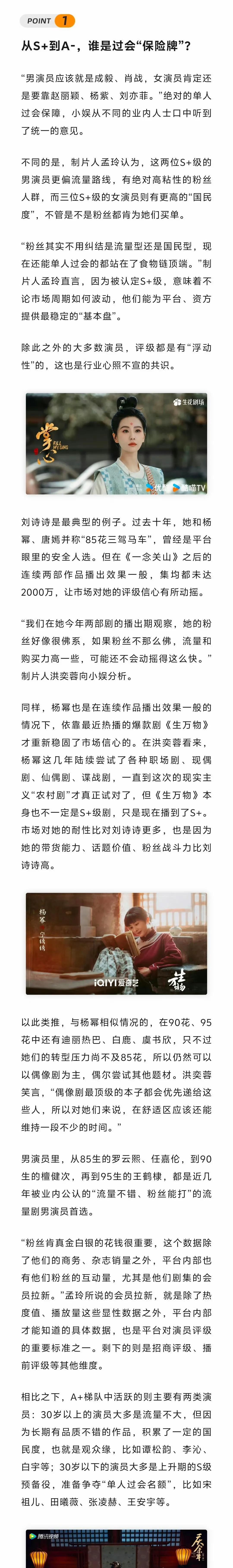 这个暑期档,杨幂凭借爆款剧《生万物》的破万成绩,稳稳巩固了自己绝对S级的市场评级。此前,因连续几部作品播出效果未达预期,行业内曾出现“杨幂可能要掉队”的议论。尽管平台对演员的评级不会因一部剧立刻反转,但一段周期内作品的持续表现,足以重塑市场对演员的信心,而杨幂显然做到了这一点。