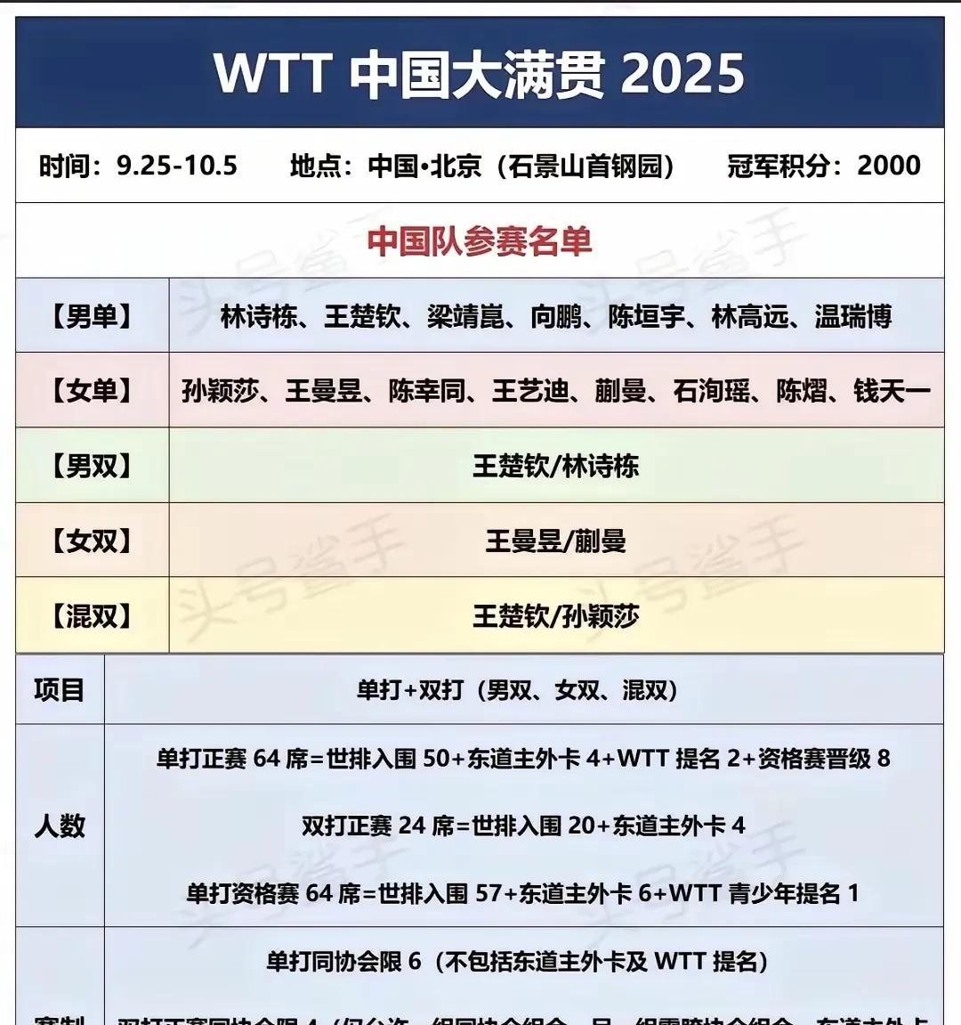 北京大满贯,林诗栋全力冲冠,王楚钦兼三。 目前王楚钦和林诗栋只差1000分,林诗栋需要再拿一个大满贯才稳定。 这次北京大满贯, 林诗栋不再兼三可以理解, 前几场大赛都是兼三, 单打成绩却不理想。 这次北京大满贯, 王楚钦给他托个底, 让小石头拼命冲吧。