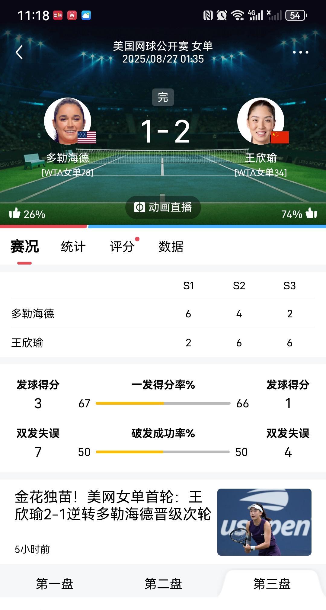 在今天凌晨结束的美网女单首轮比赛中,中国金花王欣瑜承载着中国球迷唯一希望,王右也不负众望,在2-6先丢一盘的情况下,绝地反击,6-4、6-2连下两城,战胜本土作战的美国选手多勒海德,挺进女单第二轮。王欣瑜再次成为中国选手的美网独苗。下一轮继续加油!