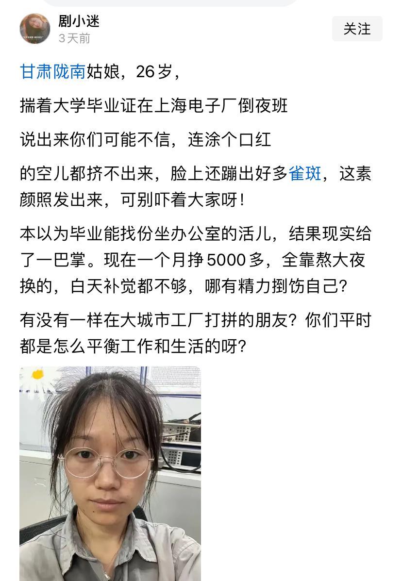 没时间打扮的女孩,你愿意处对象吗? 女孩是甘肃人,26岁了,大学毕业找不到白领工作,最后在电子厂做蓝领,一个月挣五千,还是靠上夜班拼的。唉!大老远去大上海挣五千真没意思,结识个男友早点回老家发展,在上海混不上一万以上的工资,没有混下去的必要。如果是外地女孩子,28岁还未找到对象,建议尽快离开一线大城市。像这位女孩,回老家找个挣三千的工作也行,打扮打扮解决人生大事才是首要的,你说呢?