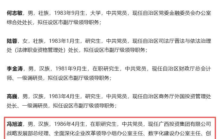 在广西发布的11名干部任前公示中,有6人皆是“80后”,其中最受关注的当属冯旭波,生于1986年4月的他,今年只有39岁,有望成为广西最年轻的厅级干部。 2020年,37岁的孙睿君升任百色市委常委、组织部长,成为广西彼时最年轻的副厅级,去年8月孙睿君已经升任科技厅厅长,目前仍是广西最年轻的正厅级干部。 冯旭波入职后长期在广西投资集团工作,早期一直负责集团的材料起草、督办落实、信息调研、综合秘书、公文办理等工作,网上随处可见他当年以通讯员身份发表的各种报道文章。此后,冯旭波又担任过董事会秘书、集团办公室主任,同时还兼任集团多个院处的负责人,期间还担任广投智慧服务集团的董事长。 在多重身份中,冯旭波还担任驻老挝代表处主任、首席代表。值得注意的是,作为广西投资集团在海外设立的首家代表处,在今年8月12日刚刚得到老挝方面的批复。 冯旭波的拟任新职,是设区市副厅级领导职务。也就是说,他将离开任职多年的企业,转入地方仕途,在地市层面担任副职,从企业到地方,这无疑会成为冯旭波仕途当中极为重要的转折点。 放眼国内,现在最年轻的副厅级干部,是现任宁夏石嘴山市副市长的李超,生于1989年7月的他,是一名“准90后”。 李超的工作经历和冯旭波颇为相似,李超从南开大学毕业后,进入银行工作,后来从北京调入宁夏,在中信银行宁夏分行下属部门担任总经理。2015年调入宁夏国资集团投资部,先后担任副部长和部长,2021年升任集团副总经理,年仅32岁的他成为最年轻的副厅级干部。担任副总经理的同时,李超还同时担任董事会秘书。 担任副总经理4年之后,李超于2025年2月转入地方仕途,出任石嘴山市副市长,分管工作仍然是他熟悉的金融领域。 #头号创作者激励计划#