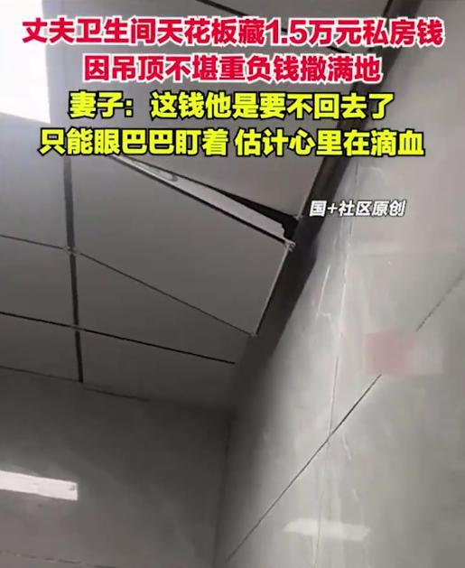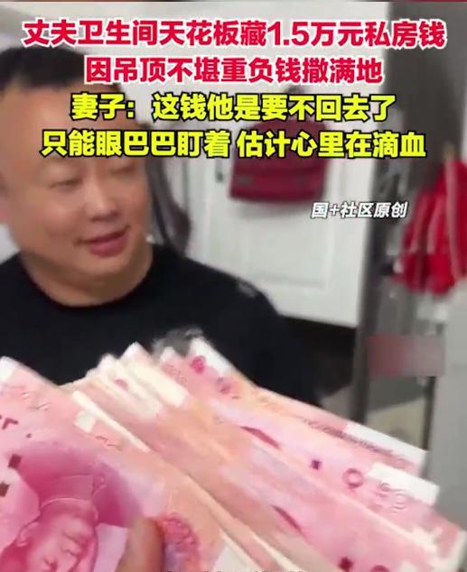 笑死了!山东临沂,女子回家时,突然发现卫生间地上散落着一地的百元大钞,抬头一看,钱竟然是从天花板漏下来的,数了下足足有15000块,后来才知道,这竟然是老公藏得私房钱,没想到却被天花板给“出卖了” 在现实生活中,藏私房钱的方式五花八门,有男子将钱藏在空调、帽子、旧衣物中,其中放在天花板吊顶中是不少人的选择,男子也是一样,本以为自己做的天衣无缝,没想到天花板却突然漏了 女子称,她一开始也很懵,但后来想了想,就一下想通了,等老公回来就当面质问他,看他那么慌,一下就明白自己猜对了,这还真是他藏起来的 事后,女子还不忘复盘一下,她觉得老公有点傻,因为把钱都放在了一个地方,如果均匀分开放着,也不至于把天花板给压塌了,这笔钱他是别想拿回去了 有网友说:我老公的私房钱藏在卫生间顶部的灯座里,关键他只往进放也不数,我没直接清空,两三个月没收一次 说起来,其实像这样藏私房钱翻车的事,真不少见。有人把钱塞进空调罩里,结果被修空调的师傅发现;有人塞进旧帽子,被妈妈打扫卫生时直接捐了;还有更惨的,藏鞋里,被狗叼出来撕个粉碎 我觉得,私房钱本身不是问题,问题是藏的方式和动机。有的人是想给自己留点零花空间,有的人是想备点惊喜,但也有可能反映夫妻之间沟通不够、信任不足 一段好的关系,其实不需要靠“藏”来维持自由,坦诚相处,反而更轻松,家是两个人一起经营的,钱最终还是要用在家庭上,与其费尽心思去藏,还不如开诚布公商量着花