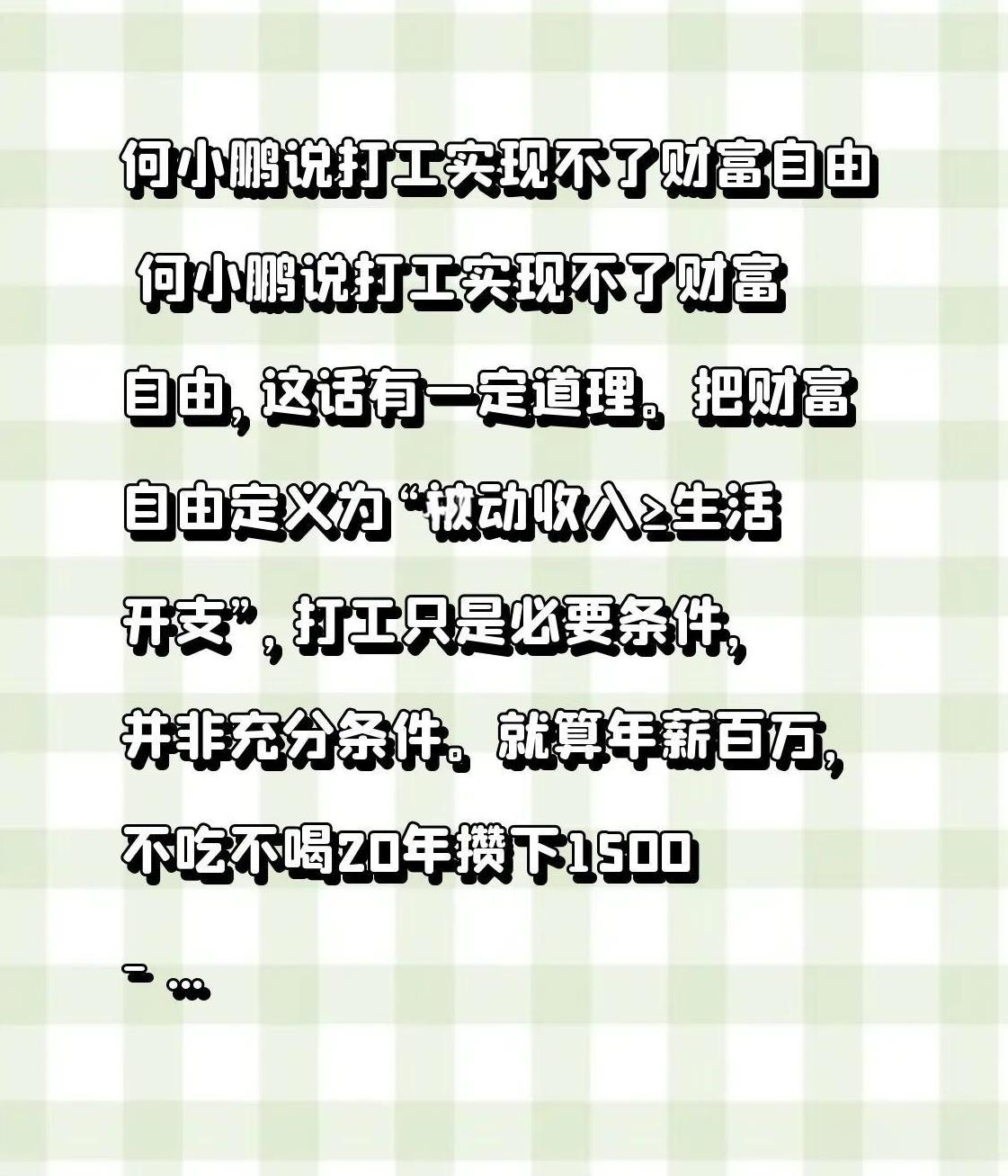 何小鹏说打工实现不了财富自由 何小鹏称打工无法达成财富自由。何小鹏的这一说法,是有几分道理的。若将财富自由界定为“被动收入≥生活开销”,那么打工仅仅是一个必要条件,而非充分条件。即便年薪达到百万,不吃不喝地积攒20年,能够攒下1500 - 3000万的金融资产,按照4%的安全提取率来计算,每年的被动收入大概为120万,这才刚刚够得上“一线自由”,而且这还只是理想的状况。 纯粹的打工收入的增长是呈线性的,有着显著的天花板。若要实现财富自由,就必须要有副业现金流或者股权收益,它们能够以指数级的方式放大财富。打工者可以加入高速发展的公司获取期权,或者在下班后从事能够产生可复制收入的副业。然而,人人都实现财富自由本就是一个伪命题,普通打工者有收入保障,生活没有后顾之忧,即便不实现财富自由也挺好的。 #何小鹏工厂# #深圳财务自由# #财富自由秘诀# #财富自由心得#