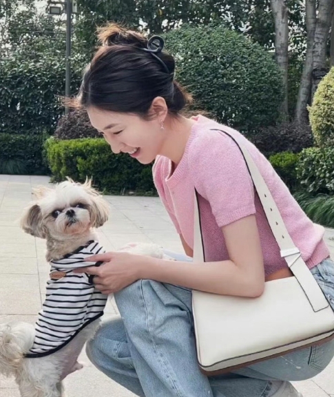 江疏影出门遛狗,她在生活里状态很松弛,像是邻家姐姐。