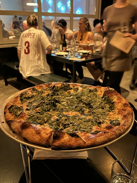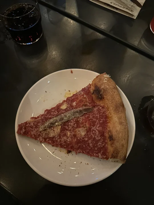 Pizzeria Beddia真好吃呀!建议起码三个人去吃,来个红酱一张、青酱一张,再来一个老本地网红冰激凌1-900-Ice-Cream提供的soft serve,一整晚都是嗨的。我们点的tomato+anchovy这款,大胆地往每一切片上扔了一根鳀鱼,鲜咸浓重,适合不怕重口味的朋友们。这款青酱更柔和,应该没有人会觉得不好吃。最最重要的,面饼本身就值得跑一趟了!让我想起来在意大利吃bianca的日子[喝奶茶R]不要忘了提前订位,虽然场子挺大且很多人打包外卖,但周末还是非常火的。