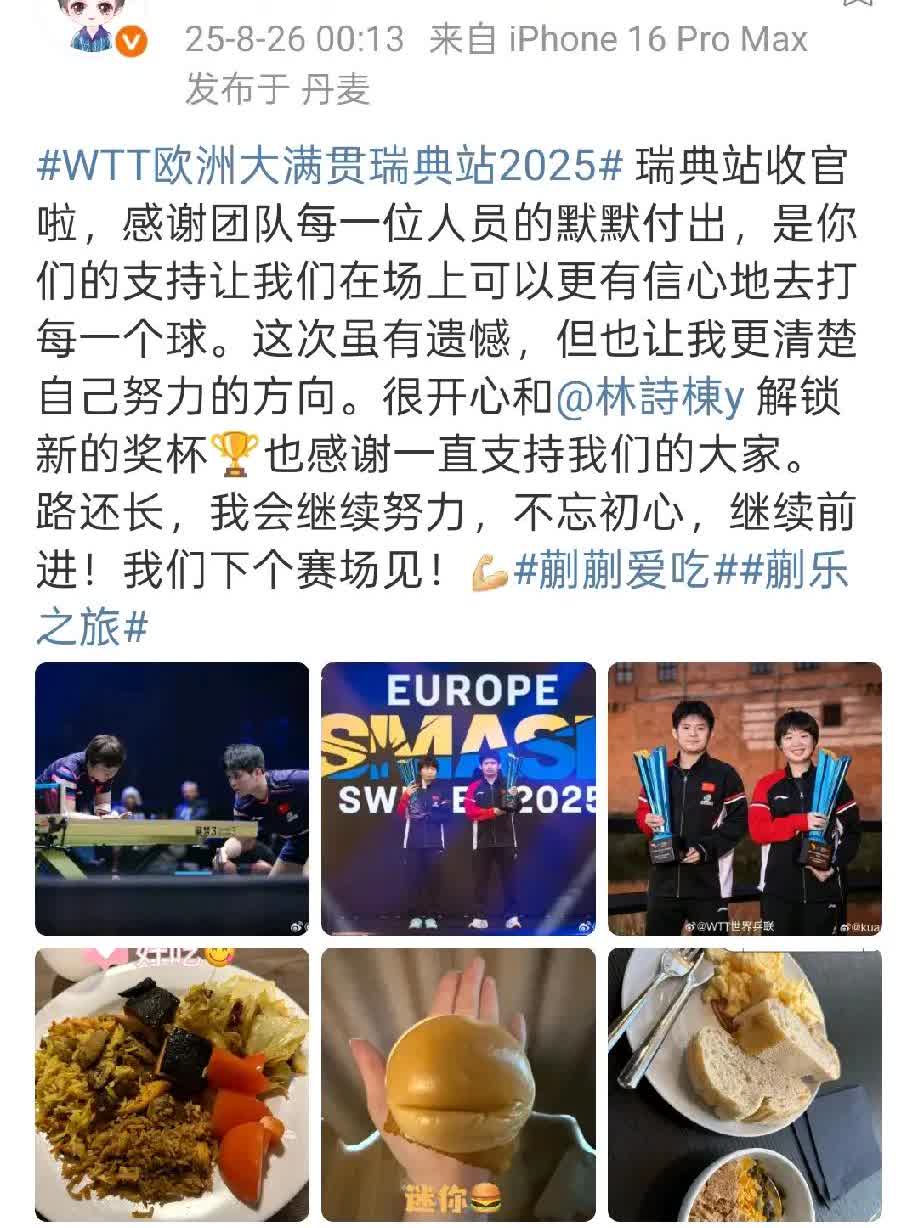 还是蒯曼大气,不仅发文和林诗栋互动,而且前三张配图,都是和林诗栋的合照。 还说很开心和林诗栋解锁新的奖杯,看的出来蒯曼混双夺冠很开心。 也看得出来蒯曼热爱美食,发三张喜欢吃的图片。 喜欢很真实的蒯曼,发图没有都是比赛现场,而是发了更多美食美景。 大满贯蒯曼有遗憾,女单两场内战,会让她五味杂陈吧,和何卓佳险胜,还被挑战鹰眼。 和石洵瑶尽管比分,没上一场那样难看,但连输二次是会有心结的。 蒯曼继续加油努力吧,希望下个赛场看到你的突破。 图片来自网络侵权可删。