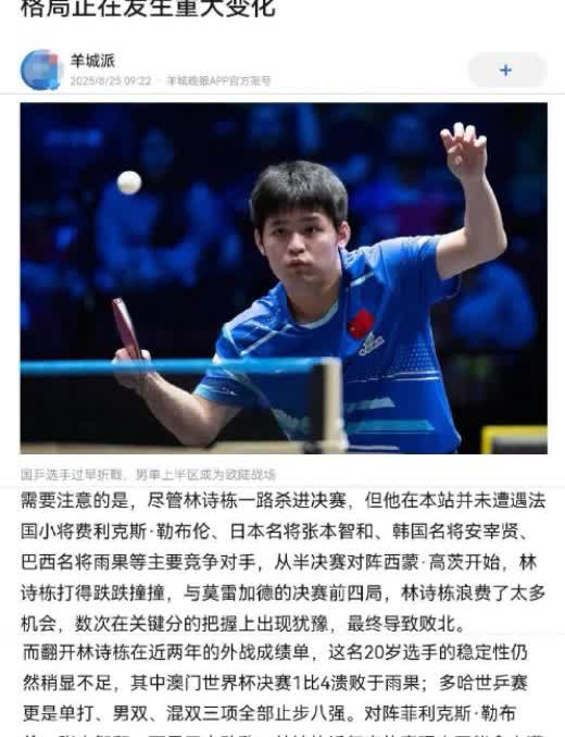官方媒体点名痛评男乒,外战实属外行,世界排名是假象,王皓脸面挂不住 早些时候,知名媒体评价了国乒男队球员林诗栋在WTT欧洲大满贯瑞典站上的表现。由于林诗栋算是这一次出征的国乒男队球员里表现最好的那一个,所以该媒体明面上是评价林诗栋,实际上是在评价这一次参赛的国乒男队的所有球员。先来看看这一次国乒男队的球员在比赛中的表现,就单打来说,林诗栋拿到亚军,梁靖崑、陈垣宇、温瑞博打进32强,向鹏、林高远遭遇一轮游。 该媒体对林诗栋的表现是这么评价的:第一、尽管林诗栋闯进了决赛,但是他没有遇到强大的对手。在林诗栋晋级男单决赛的过程中,他基本上没有遇到什么强敌,诸如张本智和、费利克斯-勒布伦、雨果等人都提前被淘汰了。第二、进入半决赛后,林诗栋的发挥就不如人意。在半决赛上,林诗栋被西蒙-高茨逼入绝境;在决赛上,林诗栋又一度被莫雷加德拉开比分。 第三,虽然林诗栋是世界第一,但近两年的外战成绩糟糕。在澳门世界杯男单决赛上,林诗栋1-4被雨果击溃;在多哈世乒赛上,身兼三项(男单、男双、混双)的他全部止步八强;在对阵张本智和的时候,最近的5场比赛他输掉了其中的4场;对阵雨果的时候,近期遭遇了两连败;对阵费利克斯-勒布伦的时候,他最近的成绩是1胜3负…… 最后,该媒体给出了最终的评价:国乒男单“外战”外行,男乒世界格局正在发生重大变化。尽管该媒体的说辞有点激烈,有的甚至不中听,但有一说一,其评价还是中肯的。试想,连世界排名第一的林诗栋尚且如此,其他人的表现就可想而知了。针对这样的评价,王皓和王励勤的脸面自然是挂不住了,但这是不争的事实。眼下,国乒男单能依赖的也就是樊振东和王楚钦,可樊振东暂离国家队,而王楚钦太累了。如果,今后的国乒男单林诗栋无法扛起大旗,那么国乒男队的未来能靠谁呢? 世界排名是假象,希望男队的球员知耻而后勇啊!