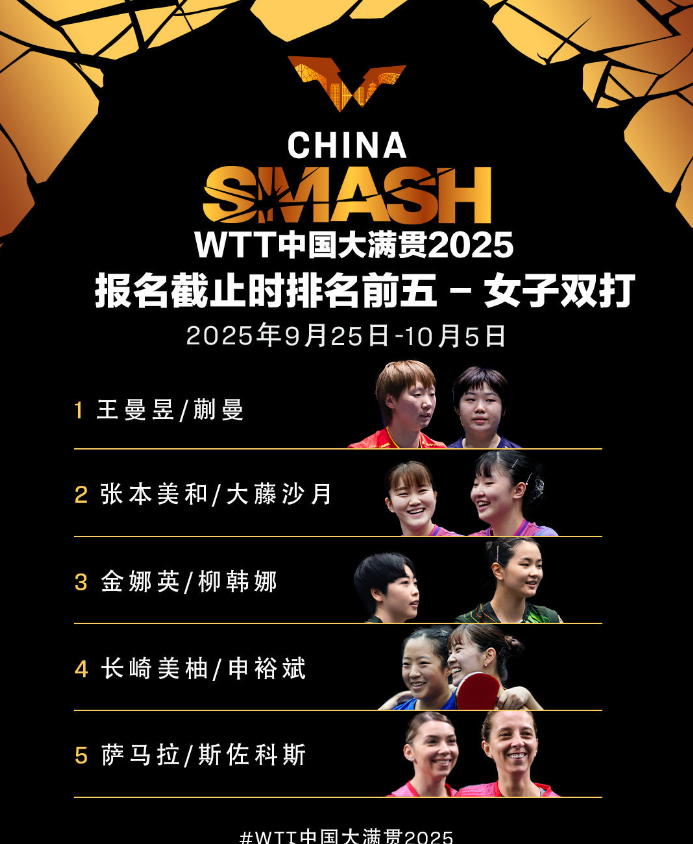 9月25日至10月5日,WTT中国大满贯2025将在北京石景山首钢园举行。报名截止时,排名前五名单如图,一起为国乒加油!