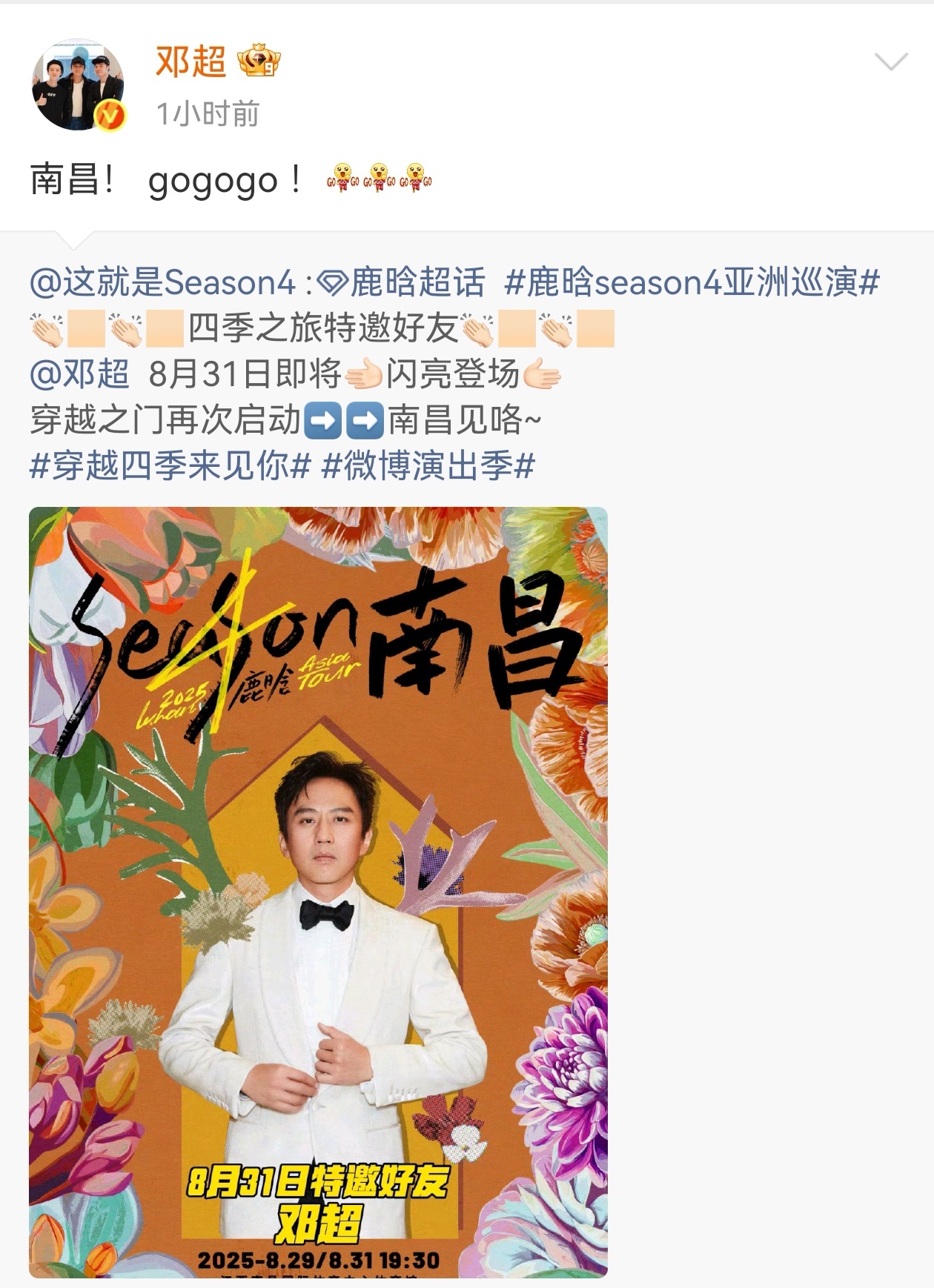 鹿晗南昌演唱会官宣嘉宾邓超“Season亚洲巡演”南昌站,特邀嘉宾即将重磅登场!两人从《奔跑吧》的“父子组合”到十年默契老友,鹿晗曾为邓超电影无偿献声,邓超更是多次力挺鹿晗舞台。这次邓超作为江西南昌人回返乡助阵,妥妥的“主场作战”!!!