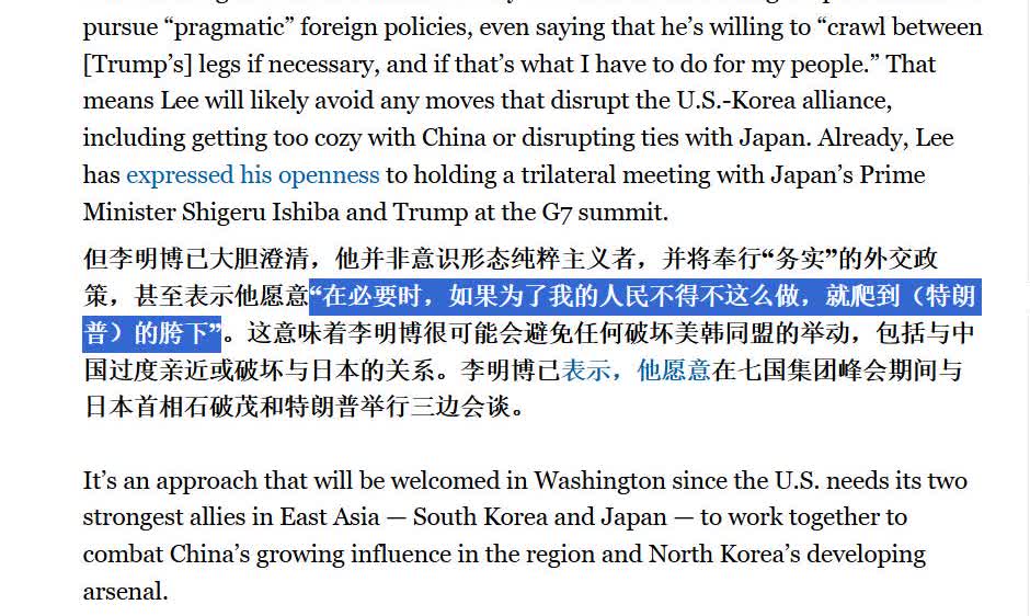 【机会中国给了韩国,自甘给川普钻裤裆的韩国总统,没资格来看我们的阅兵】 韩国总统李在明最近把“媚美”二字演绎到了新高度。为讨好川普,他不仅忍受美方“最低规格接待”,被逼着把3500亿美元对美投资“文件化”,甚至提议让川普在朝鲜建“川普大楼”。可转头就对中国玩起“两面派”,自己不敢来华出席抗战胜利80周年阅兵,却派特使团来华“赔笑脸”,把“中食美宿”的算盘打得噼啪响。 李在明抵美时,美方连部长级官员都没派,仅副礼宾长和韩裔上校接机。川普更像讨债鬼,会前发声称韩国在“搞清洗”,会中逼他承诺“遏制中国”,甚至暗示要收回驻韩美军基地土地。 为过关,李在明全程“忍辱负重”:夸川普办公室“气派”,陪聊高尔夫,还顶着惹怒朝鲜的风险献媚:“您在朝鲜建大楼,就能当和平缔造者。”《纽约时报》毫不留情戳穿:“他曾说‘必要时愿爬进川普两腿之间’,现在真做到了。” 我们原计划邀请李在明来华出席“9·3大阅兵”,而李在明却不敢接过这份英雄帖。怕得罪美国,只派前国会议长朴炳锡带亲笔信来华,嘴上说“想改善中韩关系”,转头就在美国智库演讲,说什么“韩国不能再走‘安美经中’路线……美国明确对华牵制方针。如此一来,韩国也只能在美国的基本政策框架内行动和做出判断。” 几个意思?说白了就是如果美国硬逼着韩国遏制中国,韩国是不敢不从的 抗战胜利阅兵是给英雄的献礼,一些个干大事惜身,见小利忘义的碌碌小人,确实不配。李在明宁可去华盛顿受辱,也不愿以战胜国领袖身份站上天安门。在普京等真豪杰身边,钻裤裆的“软骨头”只会显得更可笑。 给你韩国机会不中用,那就别怪我们不客气了。百年未有之大变局已经进入下半场了,还想着当老艄公两头讨好?这种人最后只能被后浪拍扁在沙滩上。 中方回应