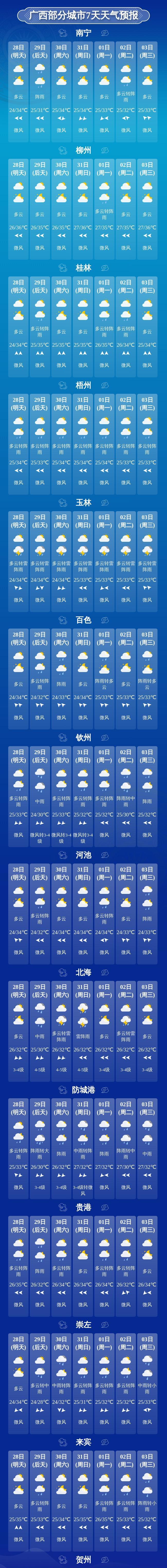 #广西天气#【全区大部多云有阵雨雷雨 28日晚起桂南、桂西有雨发展】今天晚上,全区多云,其中玉林、梧州两市局地有阵雨或雷雨。 明天白天,全区多云有分散阵雨或雷雨,其中玉林、梧州、北海、钦州等市局地有大雨。 28日晚上到29日白天,桂南有中到大雨、局地暴雨并伴有短时雷暴大风等强对流天气,其它地区多云有阵雨或雷雨、局地大雨。 29日晚上到30日白天,桂西和桂南部分地区有中雨、局地暴雨并伴有短时雷暴大风等强对流天气,其它地区多云有分散阵雨或雷雨、局地大雨。 南宁市:今天晚上多云,明天白天多云、午后局地有阵雨或雷雨,偏东风1~2级,最低气温24℃,最高气温34℃。(广西气象台27日17时发布预报)