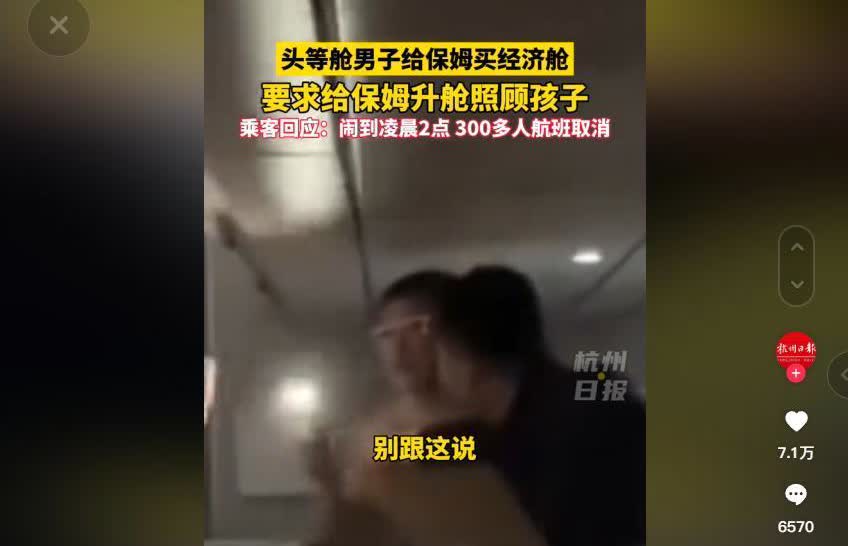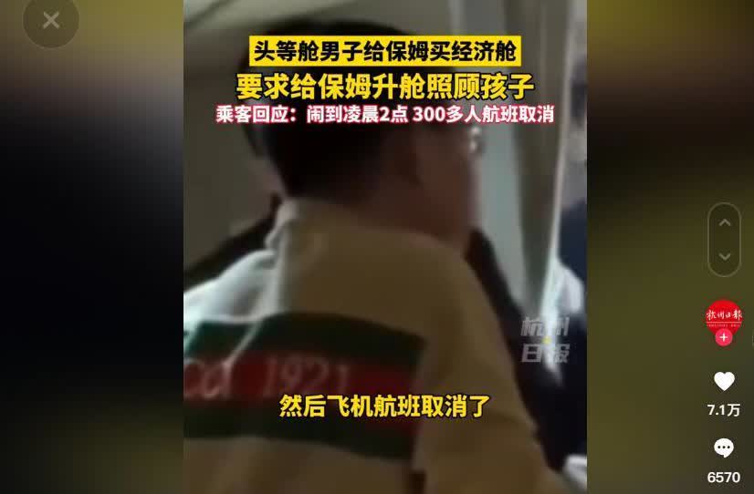 [给你小心心]男子凭一己之力,让航班取消,近300人延误改签原因是男子只买了自己和2岁儿子的头等舱,给保姆买的经济舱。但上飞机后,他以保姆要照顾小孩为由,要求免费升舱,被拒绝之后大闹飞机!目击者:凭什么让我们为他们的无赖行为买单? 这次航班本来挺好的,准备按时起飞,结果被一个男的给搅和了,害得近300人的计划都泡汤了。事情发生在去成都的飞机上,原因是他想让保姆从经济舱升到头等舱,人家没同意,他就发疯了,最后整架飞机都没飞成。 这个男的给自己和两岁的儿子买了头等舱票,保姆却只有经济舱。上了飞机,小孩一直哭,他就让保姆去头等舱帮忙照看,机组人员没答应。这下他火了,缠着乘务员不放,说“孩子没人管你们就得管”,还一直嚷嚷“你们为啥不帮我?” 机组人员好心跟他解释,座位得自己安排,升舱还得加钱,可他就是不听,还开始骂人,别的乘客都生气了。这一闹就是四个小时,都凌晨两点了,场面乱糟糟的,有个乘客实在看不下去了,拍着桌子问:“凭什么我们大家都要因为你受罪?”那男的不仅没收敛,反而更嚣张了,就是不下飞机,还想拦着别人,最后警察直接把他硬拽走了。因为这,航班也取消了,大家只好重新买票,而且谁也没得到赔偿。 结果就是,那男的被带走,航班也飞了。这事儿在网上闹得沸沸扬扬的,网友们都说他太自私了,让大家在公共场合都得讲规矩,也希望航空公司能改进一下应急处理。那男的也得琢磨琢磨,别老拿“为你好”当借口来折腾人。