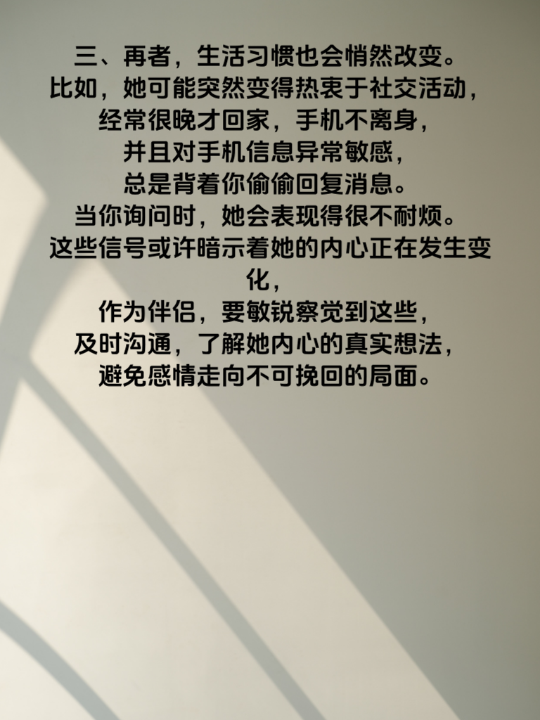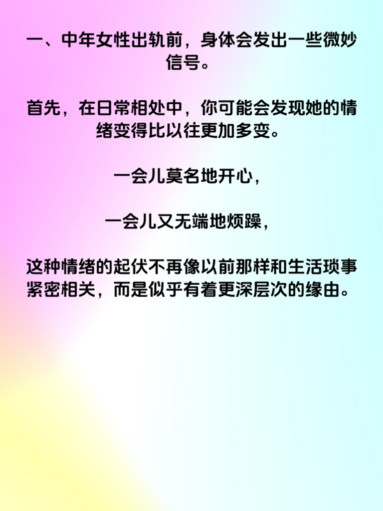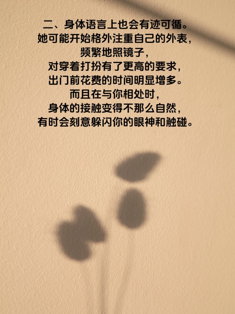 一、中年女性出轨前,身体会发出一些微妙信号。首先,在日常相处中,你可能会发现她的情绪变得比以往更加多变。一会儿莫名地开心,一会儿又无端地烦躁,这种情绪的起伏不再像以前那样和生活琐事紧密相关,而是似乎有着更深层次的缘由。 二、身体语言上也会有迹可循。她可能开始格外注重自己的外表,频繁地照镜子,对穿着打扮有了更高的要求,出门前花费的时间明显增多。而且在与你相处时,身体的接触变得不那么自然,有时会刻意躲闪你的眼神和触碰。 三、再者,生活习惯也会悄然改变。比如,她可能突然变得热衷于社交活动,经常很晚才回家,手机不离身,并且对手机信息异常敏感,总是背着你偷偷回复消息。当你询问时,她会表现得很不耐烦。这些信号或许暗示着她的内心正在发生变化,作为伴侣,要敏锐察觉到这些,及时沟通,了解她内心的真实想法,避免感情走向不可挽回的局面。