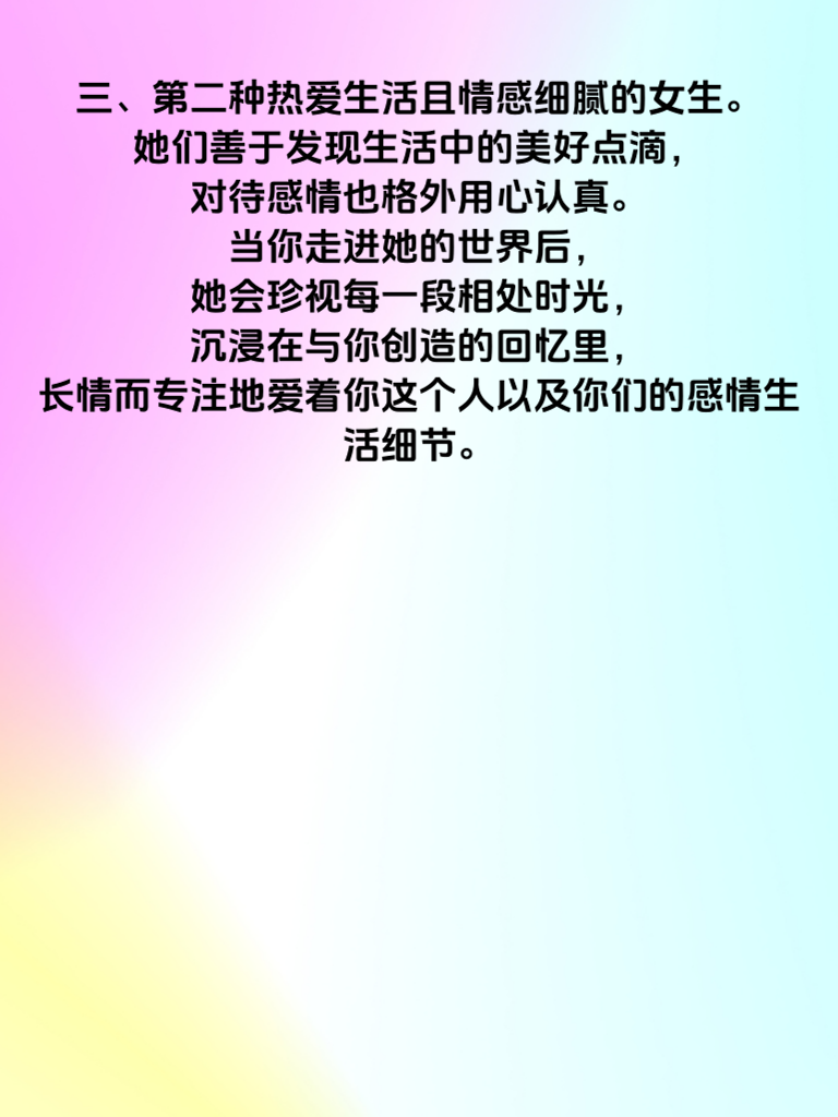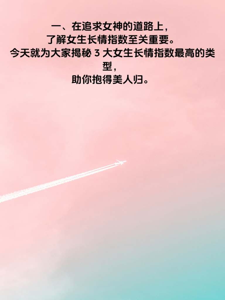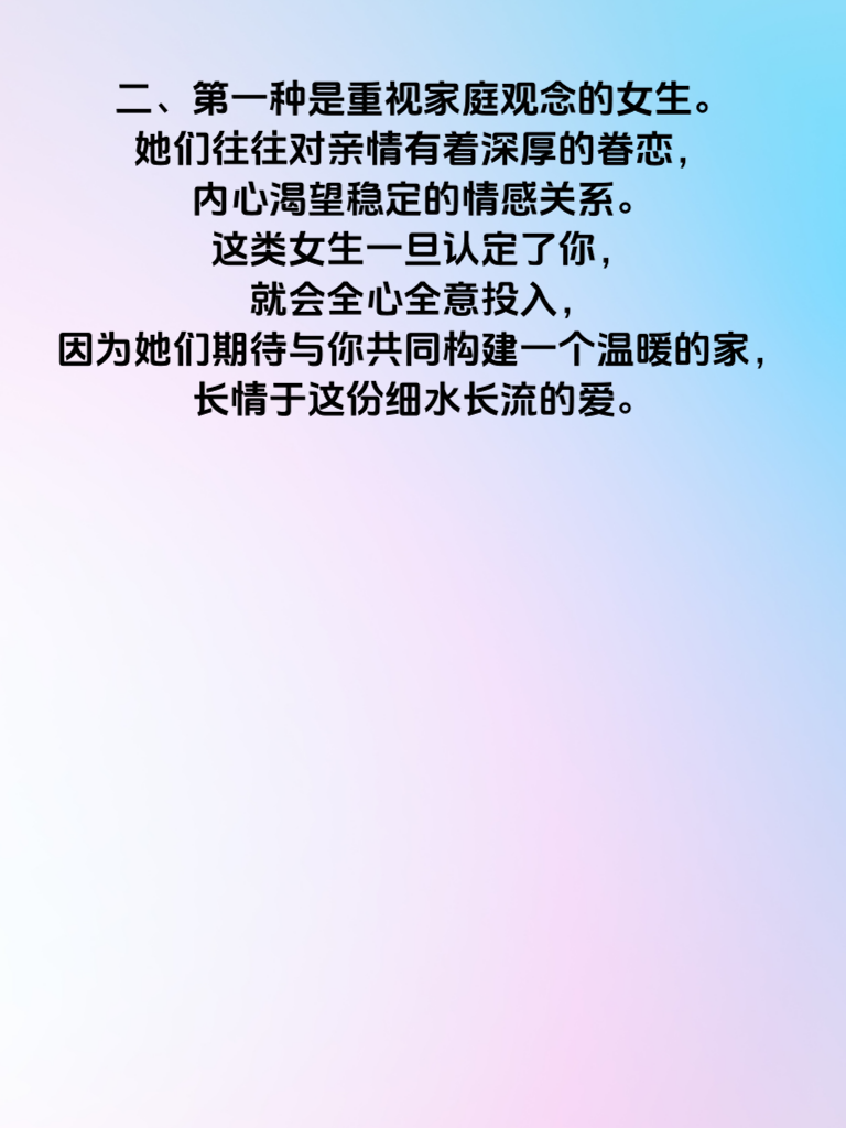 一、在追求女神的道路上,了解女生长情指数至关重要。今天就为大家揭秘3大女生长情指数最高的类型,助你抱得美人归。 二、第一种是重视家庭观念的女生。她们往往对亲情有着深厚的眷恋,内心渴望稳定的情感关系。这类女生一旦认定了你,就会全心全意投入,因为她们期待与你共同构建一个温暖的家,长情于这份细水长流的爱。 三、第二种热爱生活且情感细腻的女生。她们善于发现生活中的美好点滴,对待感情也格外用心认真。当你走进她的世界后,她会珍视每一段相处时光,沉浸在与你创造的回忆里,长情而专注地爱着你这个人以及你们的感情生活细节。 四、第三种经历过挫折但内心坚强的女生。她们对真心相待的人尤为珍惜,一旦感受到你的真诚关怀,就会紧紧抓住这份感情不放手。她们的长情源于对来之不易的温暖的执着守护,如果有幸成为她们的伴侣,你将得到一份坚定不移的爱直至永远。