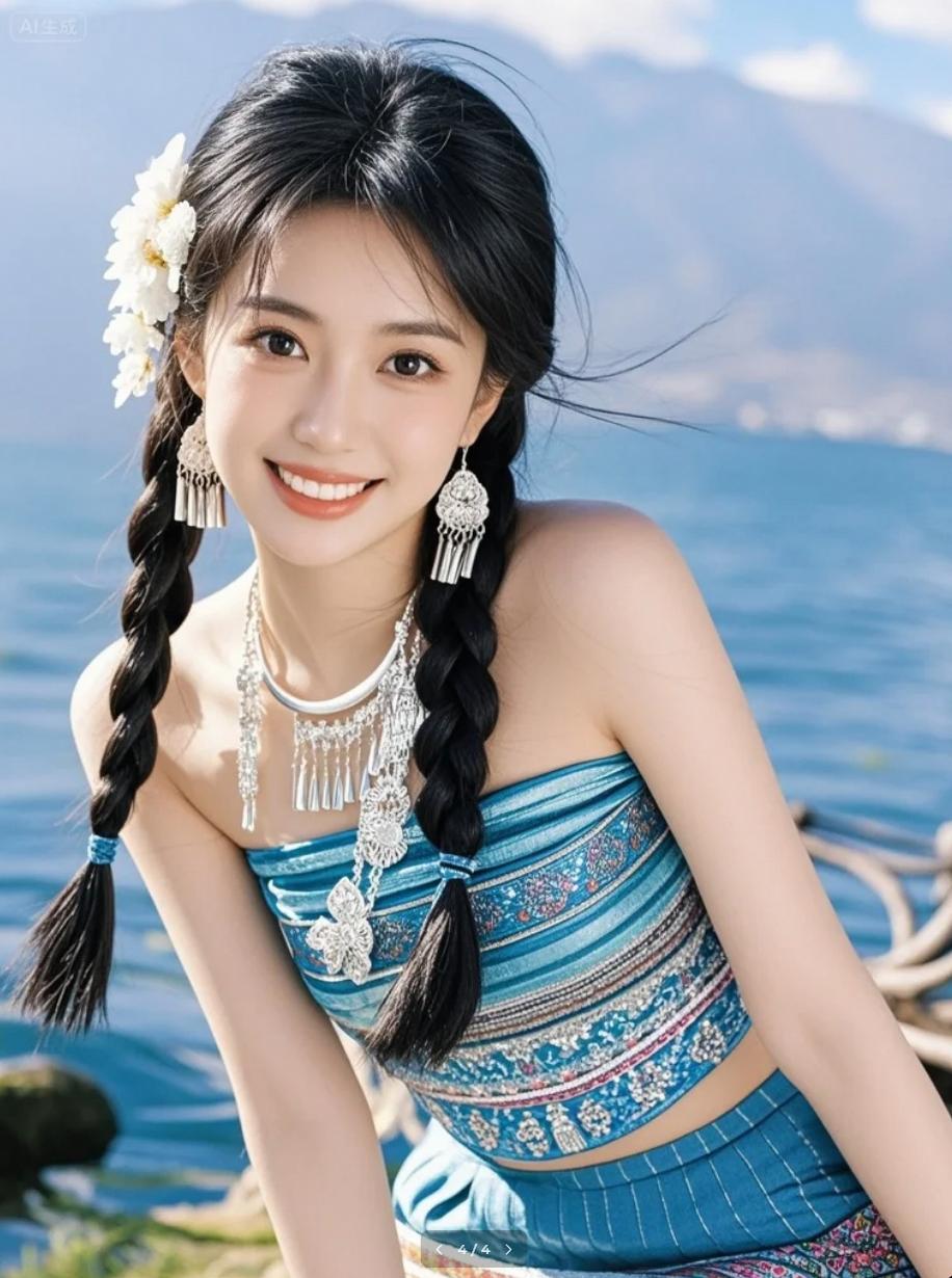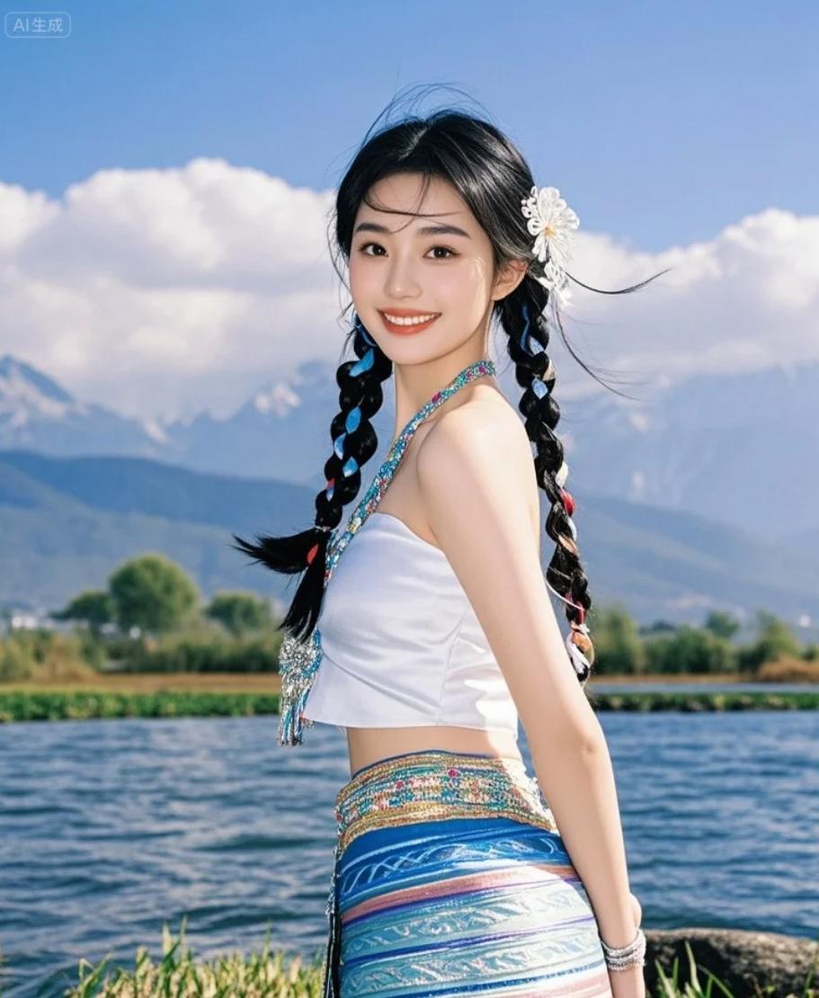 少女将一束彩色麻花辫甩向湖面:“看,我把彩虹丢进水里啦!”