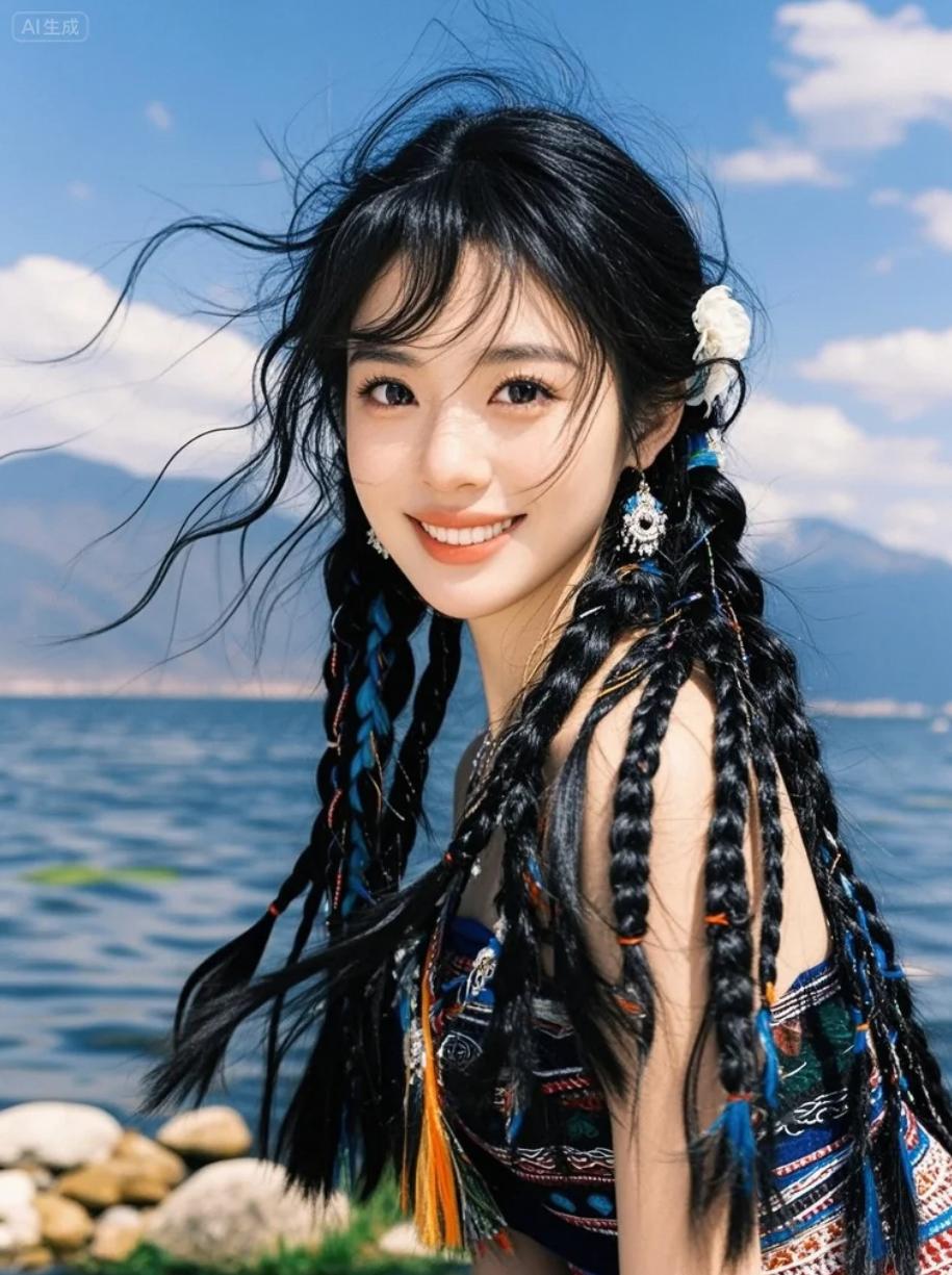 双麻花辫少女与湖面的亲密对话