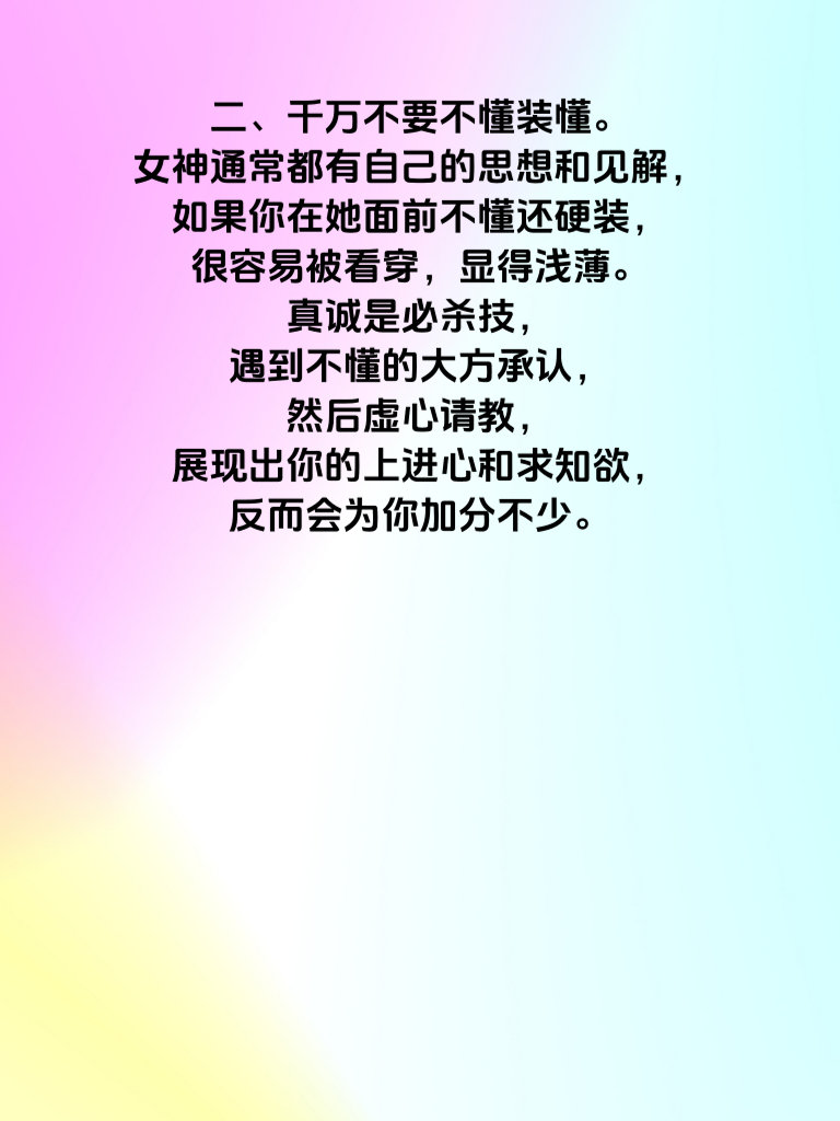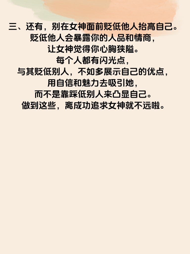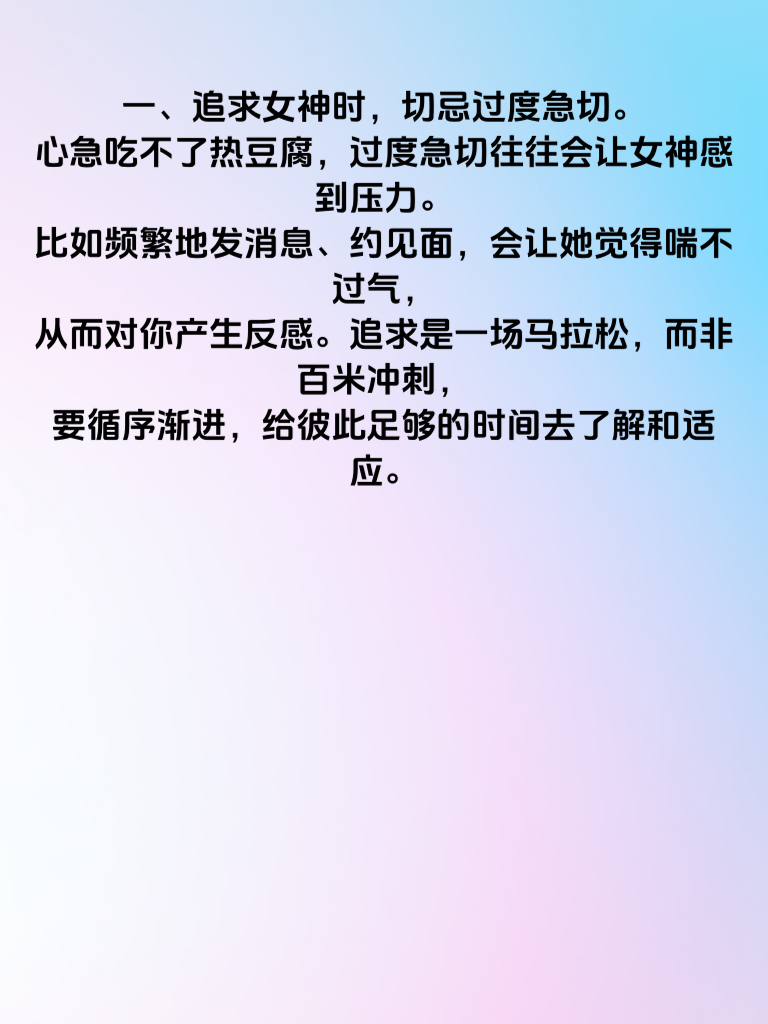 一、追求女神时,切忌过度急切。心急吃不了热豆腐,过度急切往往会让女神感到压力。比如频繁地发消息、约见面,会让她觉得喘不过气,从而对你产生反感。追求是一场马拉松,而非百米冲刺,要循序渐进,给彼此足够的时间去了解和适应。 二、千万不要不懂装懂。女神通常都有自己的思想和见解,如果你在她面前不懂还硬装,很容易被看穿,显得浅薄。真诚是必杀技,遇到不懂的大方承认,然后虚心请教,展现出你的上进心和求知欲,反而会为你加分不少。 三、还有,别在女神面前贬低他人抬高自己。贬低他人会暴露你的人品和情商,让女神觉得你心胸狭隘。每个人都有闪光点,与其贬低别人,不如多展示自己的优点,用自信和魅力去吸引她,而不是靠踩低别人来凸显自己。做到这些,离成功追求女神就不远啦。