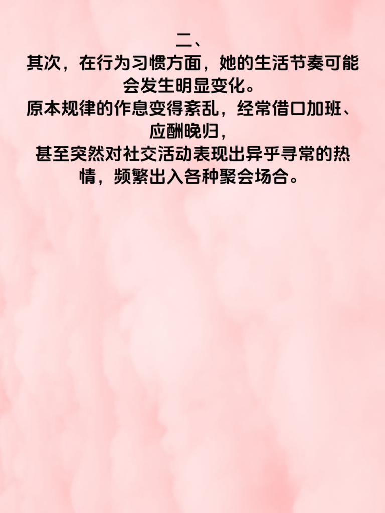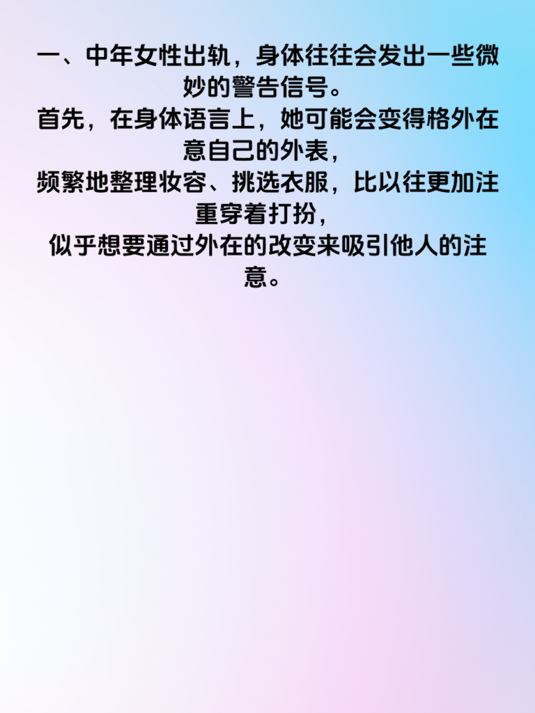 一、中年女性出轨,身体往往会发出一些微妙的警告信号。首先,在身体语言上,她可能会变得格外在意自己的外表,频繁地整理妆容、挑选衣服,比以往更加注重穿着打扮,似乎想要通过外在的改变来吸引他人的注意。 二、其次,在行为习惯方面,她的生活节奏可能会发生明显变化。原本规律的作息变得紊乱,经常借口加班、应酬晚归,甚至突然对社交活动表现出异乎寻常的热情,频繁出入各种聚会场合。 三、再者,身体的健康状况也可能透露出蛛丝马迹。她可能会突然出现一些不明原因的身体不适,如头痛、失眠等,却又不愿意去医院做详细检查,或者在某些亲密时刻表现得异常冷淡或敷衍,这些都可能暗示着她内心的变化。中年女性出轨并非毫无预兆,关注这些身体发出的警告,或许能及时察觉情感中的危机。