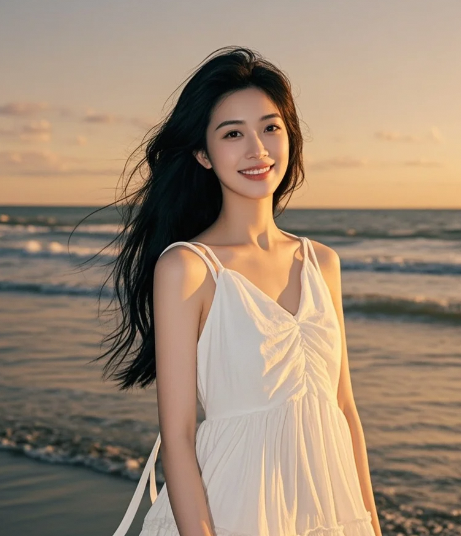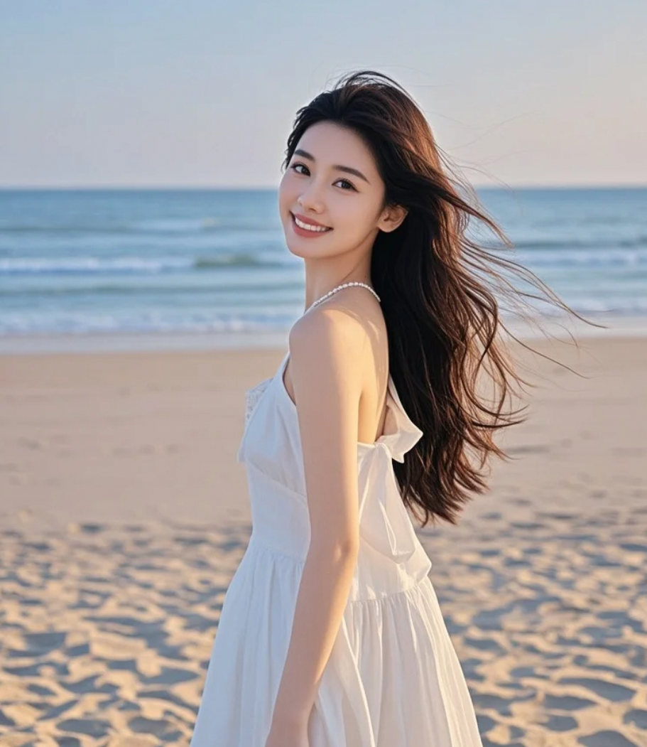 晚风轻拂,沙滩长发少女的优雅姿态如诗如画