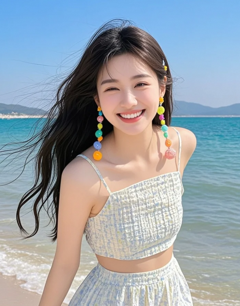 海浪轻拍岸边,应和着她内心的宁静节拍