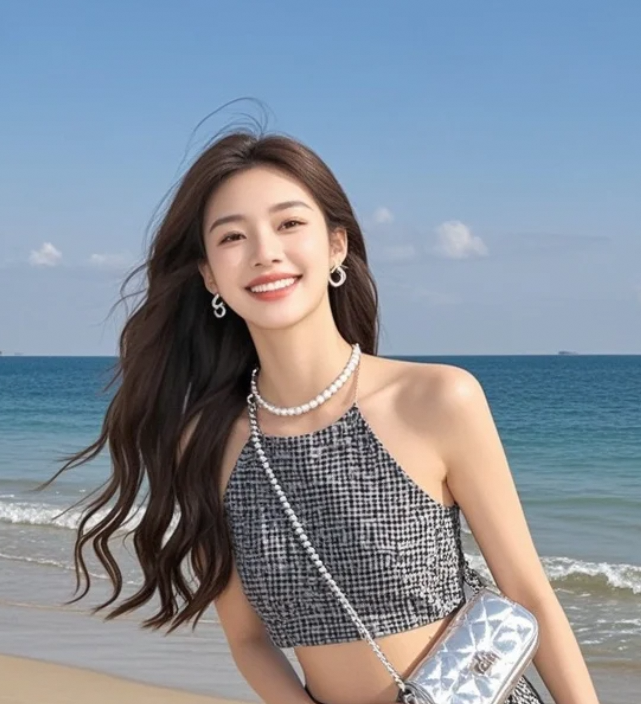 海浪轻拍岸边,应和着她内心的宁静节拍