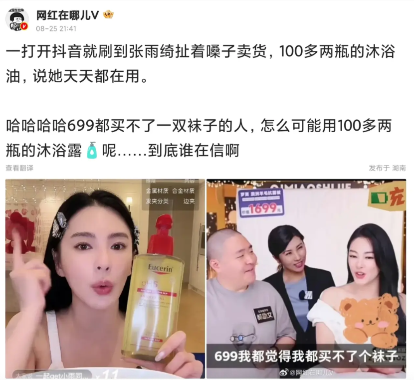 博主吐槽女明星张雨绮直播带货。 扯着嗓子喊100多两瓶的沐浴露,还说“自己”天天用。