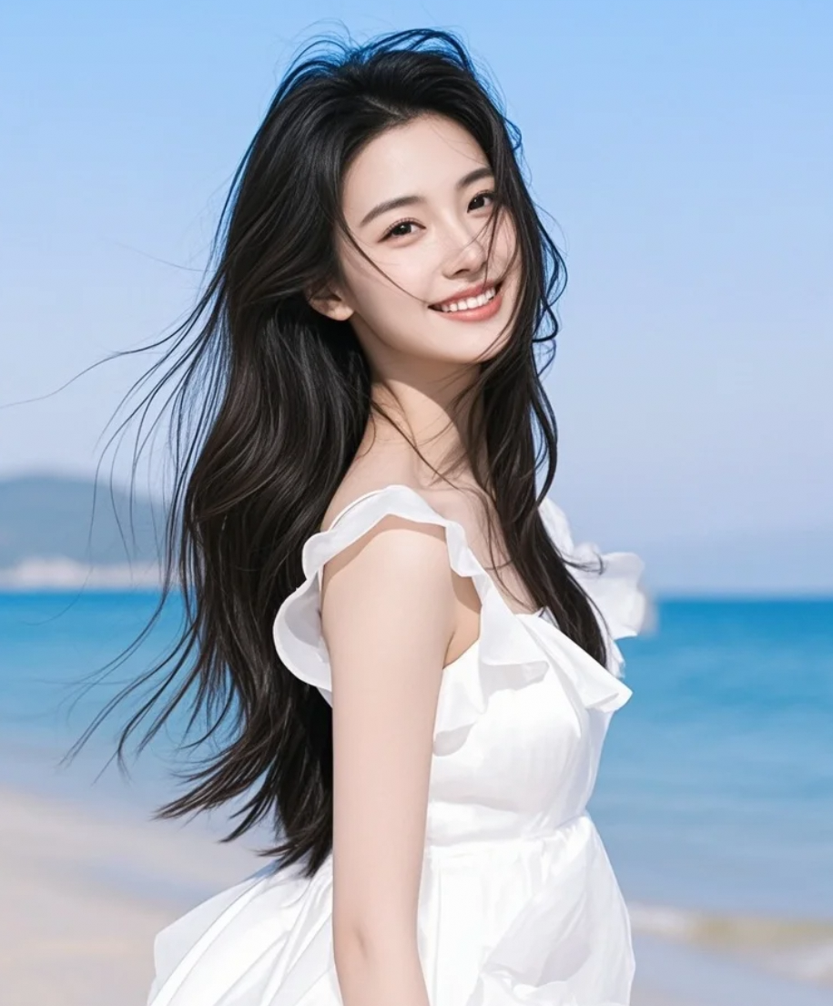 阳光明媚,沙滩上的她长发飘逸,尽显清新脱俗