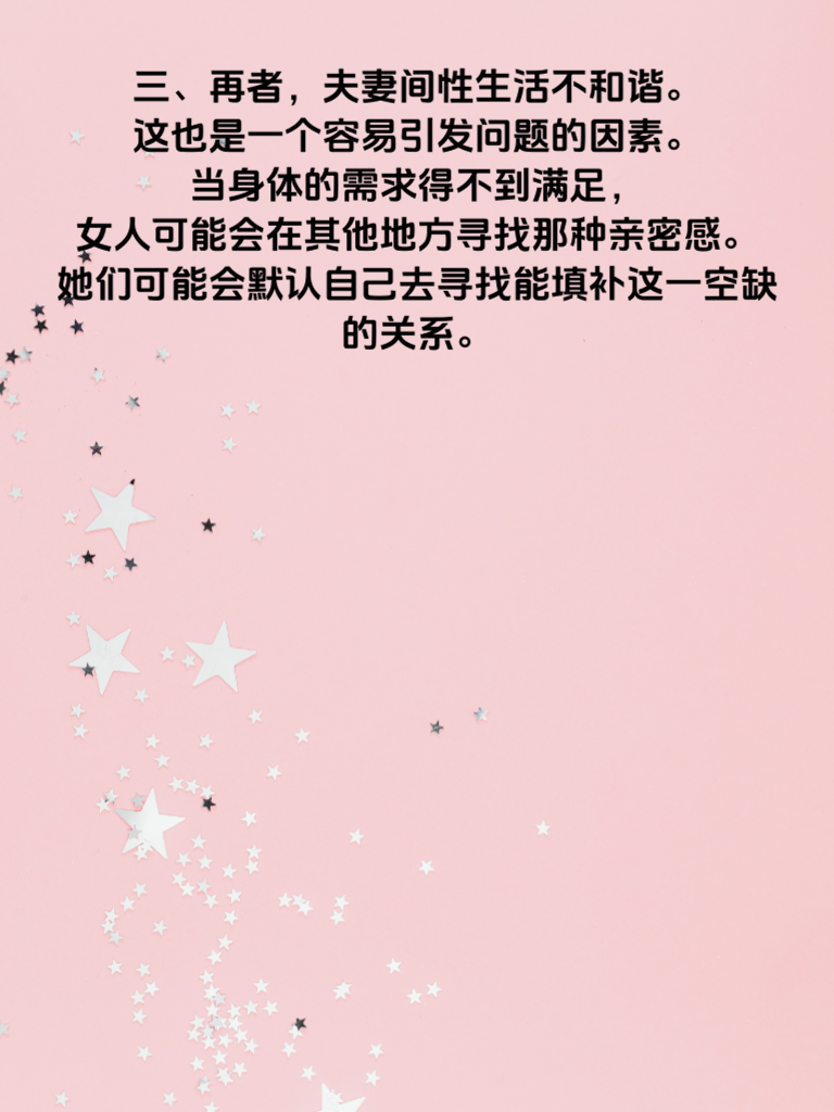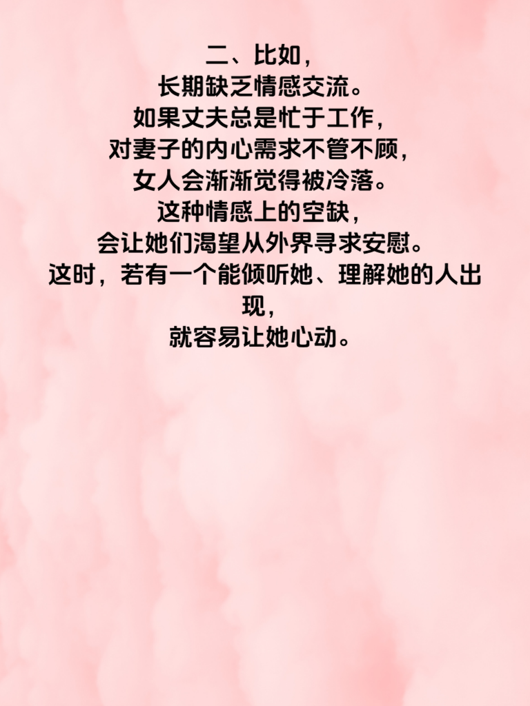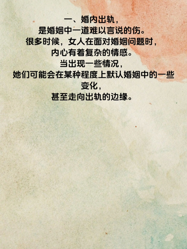一、婚内出轨,是婚姻中一道难以言说的伤。很多时候,女人在面对婚姻问题时,内心有着复杂的情感。当出现一些情况,她们可能会在某种程度上默认婚姻中的一些变化,甚至走向出轨的边缘。 二、比如,长期缺乏情感交流。如果丈夫总是忙于工作,对妻子的内心需求不管不顾,女人会渐渐觉得被冷落。这种情感上的空缺,会让她们渴望从外界寻求安慰。这时,若有一个能倾听她、理解她的人出现,就容易让她心动。 三、再者,夫妻间性生活不和谐。这也是一个容易引发问题的因素。当身体的需求得不到满足,女人可能会在其他地方寻找那种亲密感。她们可能会默认自己去寻找能填补这一空缺的关系。 四、还有,婚姻中的长期矛盾。无休止的争吵、三观不合等,会让女人对婚姻失望。她们可能会觉得在这段婚姻里看不到未来,从而默认在别处寻找新的希望。然而,婚内出轨并不能真正解决问题,只会让原本的婚姻更加破碎。所以,夫妻之间还是要多沟通、多理解,用心经营婚姻,才能避免这些悲剧的发生。