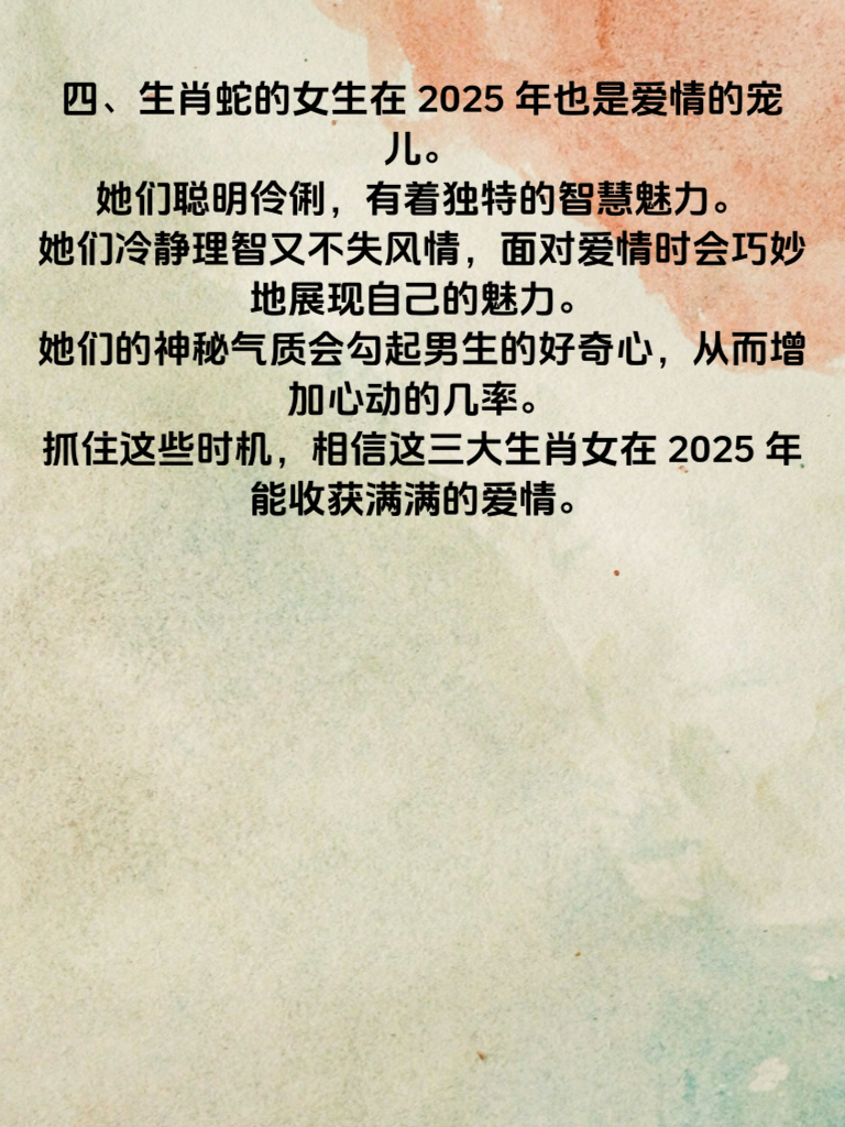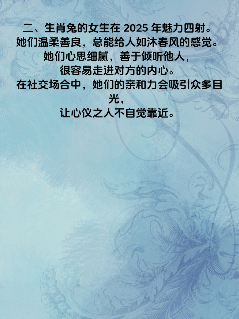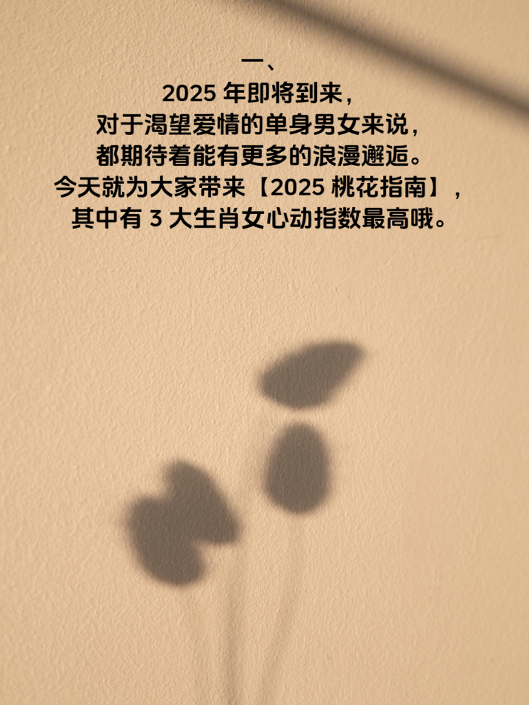 一、2025年即将到来,对于渴望爱情的单身男女来说,都期待着能有更多的浪漫邂逅。今天就为大家带来【2025桃花指南】,其中有3大生肖女心动指数最高哦。 二、生肖兔的女生在2025年魅力四射。她们温柔善良,总能给人如沐春风的感觉。她们心思细腻,善于倾听他人,很容易走进对方的内心。在社交场合中,她们的亲和力会吸引众多目光,让心仪之人不自觉靠近。 三、生肖羊的女生在这一年也有着超高的心动指数。她们性格温婉,气质优雅,身上散发着独特的韵味。她们对待感情真诚且执着,一旦认定了就会全心全意付出。这样的她们,很容易让男生心动,开启浪漫的爱情之旅。 四、生肖蛇的女生在2025年也是爱情的宠儿。她们聪明伶俐,有着独特的智慧魅力。她们冷静理智又不失风情,面对爱情时会巧妙地展现自己的魅力。她们的神秘气质会勾起男生的好奇心,从而增加心动的几率。抓住这些时机,相信这三大生肖女在2025年能收获满满的爱情。