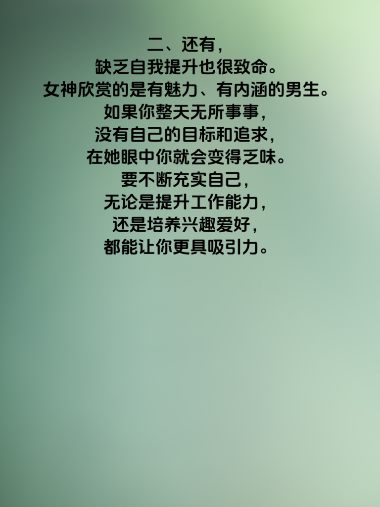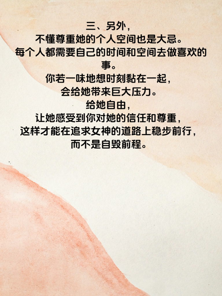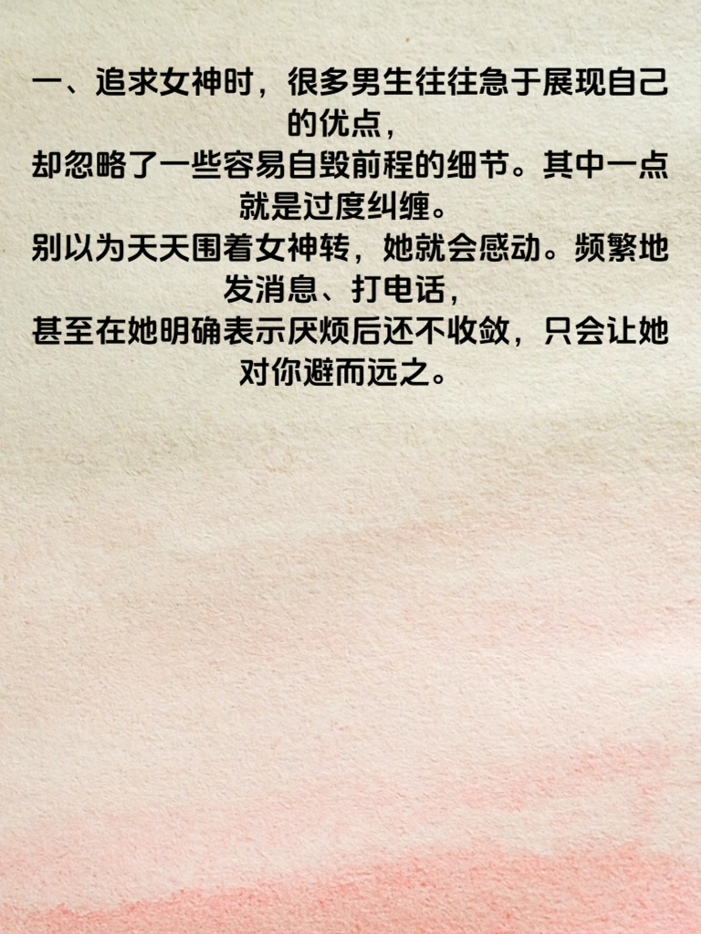 一、追求女神时,很多男生往往急于展现自己的优点,却忽略了一些容易自毁前程的细节。其中一点就是过度纠缠。别以为天天围着女神转,她就会感动。频繁地发消息、打电话,甚至在她明确表示厌烦后还不收敛,只会让她对你避而远之。 二、还有,缺乏自我提升也很致命。女神欣赏的是有魅力、有内涵的男生。如果你整天无所事事,没有自己的目标和追求,在她眼中你就会变得乏味。要不断充实自己,无论是提升工作能力,还是培养兴趣爱好,都能让你更具吸引力。 三、另外,不懂尊重她的个人空间也是大忌。每个人都需要自己的时间和空间去做喜欢的事。你若一味地想时刻黏在一起,会给她带来巨大压力。给她自由,让她感受到你对她的信任和尊重,这样才能在追求女神的道路上稳步前行,而不是自毁前程。