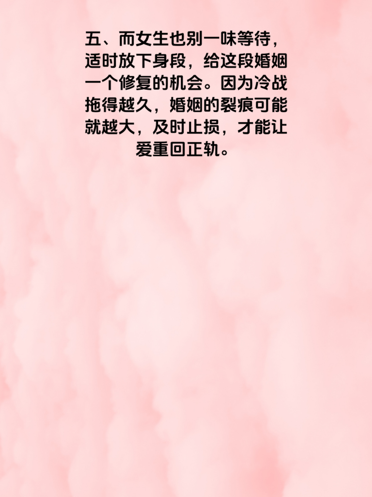 一、婚姻,本应是两个人携手走过风雨的温暖旅程。然而,当冷战的阴霾悄然笼罩,一场婚姻危机或许正在悄然降临。尤其是冷战超过3天,更需格外警惕。 二、冷战初期,双方或许只是在气头上,试图用沉默来表达不满。可随着时间推移,沉默会像一道无形的墙,隔阂越来越深。超过3天的冷战,意味着彼此心中的结越来越难解。 三、在这期间,双方都应反思。是沟通方式出了问题?还是彼此忽略了对方的感受?尝试迈出主动沟通的第一步,打破沉默。 四、对于男生而言,要展现出足够的担当。不要让冷战持续,主动找女生谈心,倾听她的想法,坦诚表达自己的歉意与爱意。 五、而女生也别一味等待,适时放下身段,给这段婚姻一个修复的机会。因为冷战拖得越久,婚姻的裂痕可能就越大,及时止损,才能让爱重回正轨。