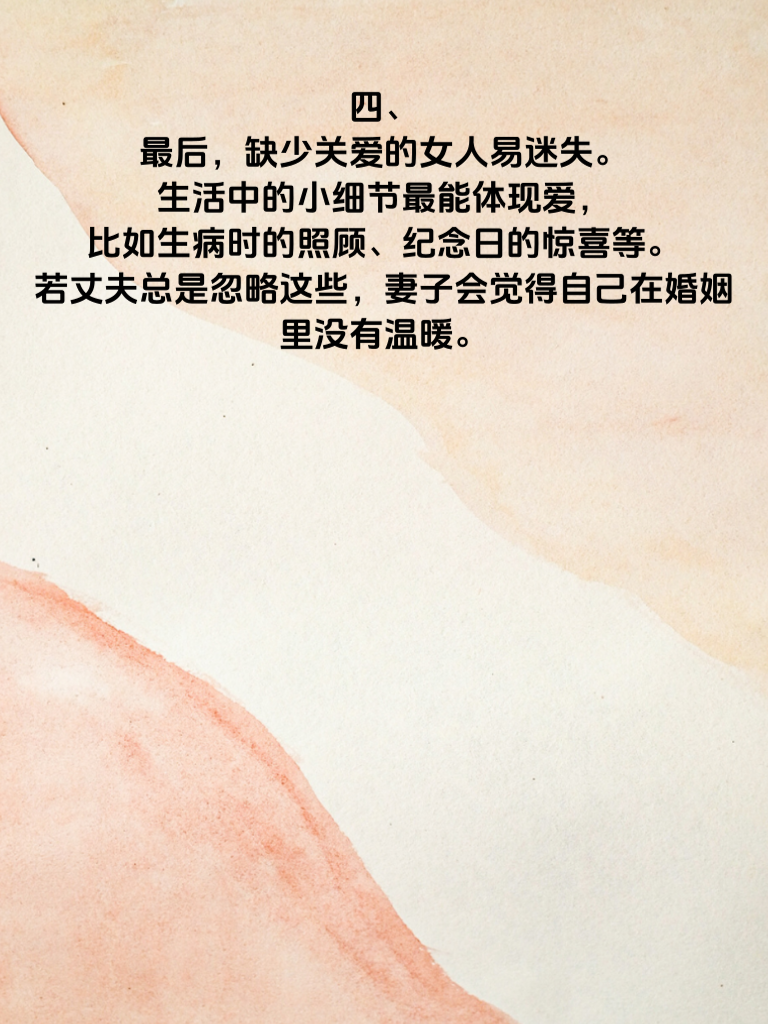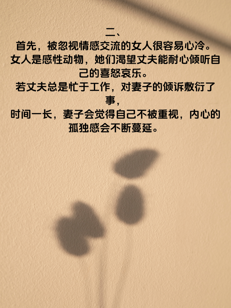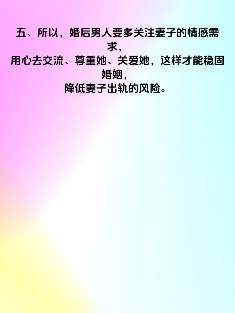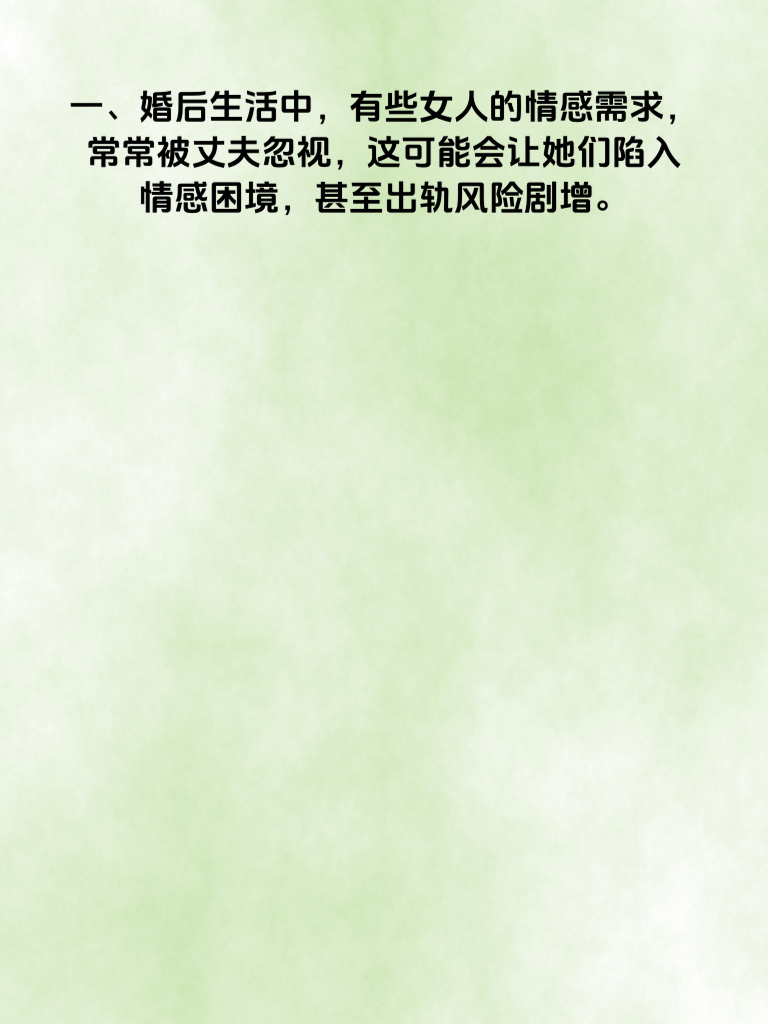 一、婚后生活中,有些女人的情感需求常常被丈夫忽视,这可能会让她们陷入情感困境,甚至出轨风险剧增。 二、首先,被忽视情感交流的女人很容易心冷。女人是感性动物,她们渴望丈夫能耐心倾听自己的喜怒哀乐。若丈夫总是忙于工作,对妻子的倾诉敷衍了事,时间一长,妻子会觉得自己不被重视,内心的孤独感会不断蔓延。 三、其次,得不到尊重的女人易生怨。在家庭决策中,如果丈夫从不考虑妻子的意见,独断专行,会让妻子觉得自己在这个家没有地位。这种不被尊重的感觉会侵蚀她对婚姻的满意度。 四、最后,缺少关爱的女人易迷失。生活中的小细节最能体现爱,比如生病时的照顾、纪念日的惊喜等。若丈夫总是忽略这些,妻子会觉得自己在婚姻里没有温暖。 五、所以,婚后男人要多关注妻子的情感需求,用心去交流、尊重她、关爱她,这样才能稳固婚姻,降低妻子出轨的风险。