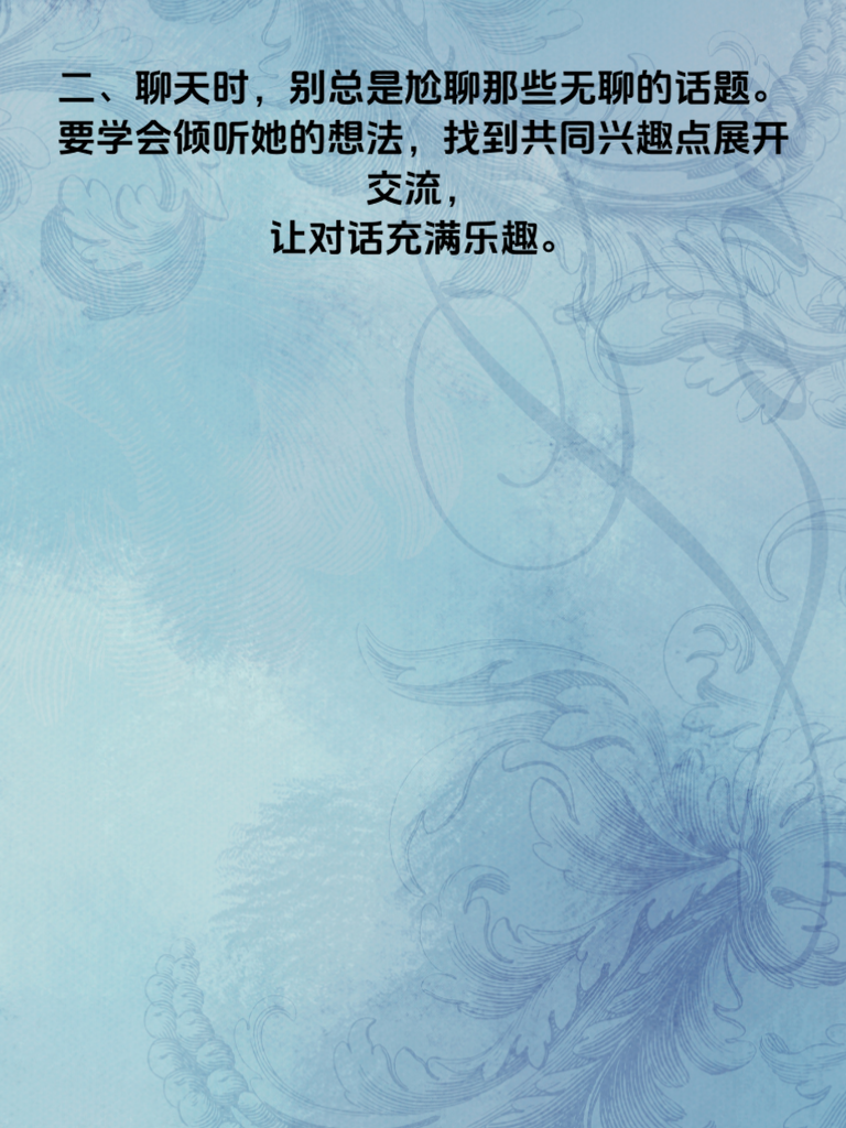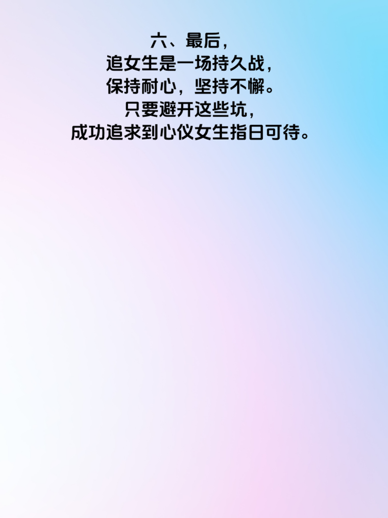 一、追女生的道路上,布满了形形色色的坑,避开它们,成功便会离你越来越近。首先要明白,真诚是永远的必杀技,切勿虚情假意,用真心才能换来她的心动。 二、聊天时,别总是尬聊那些无聊的话题。要学会倾听她的想法,找到共同兴趣点展开交流,让对话充满乐趣。 三、追求过程中,尊重她的个人空间很重要。不要过度纠缠,给彼此一些自由呼吸的时间,这样她会更舒服。 四、不要盲目送昂贵礼物,礼物不在价值高低,而在于心意。一份能体现她喜好的小礼物,或许更能打动她。 五、自身要有自信,但别过度自负。展现出积极向上的态度,同时又能谦逊待人,会让她对你好感倍增。 六、最后,追女生是一场持久战,保持耐心,坚持不懈。只要避开这些坑,成功追求到心仪女生指日可待。
