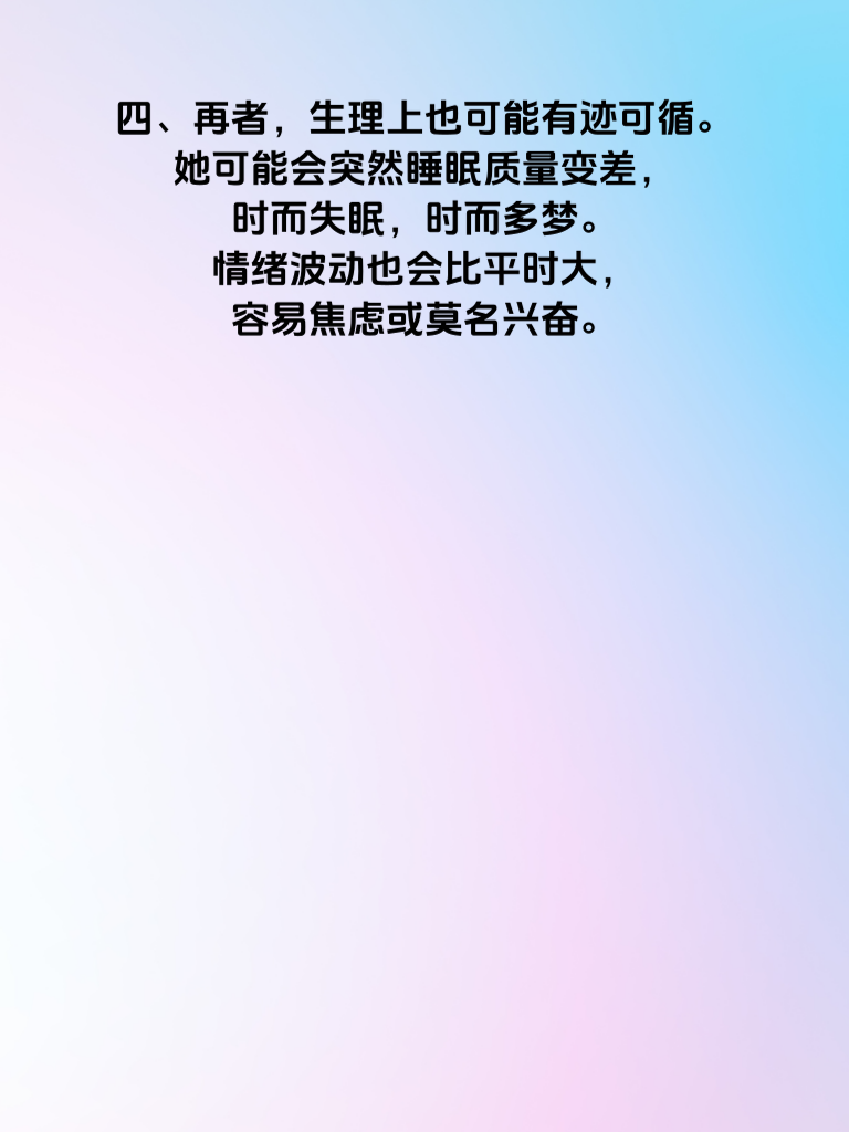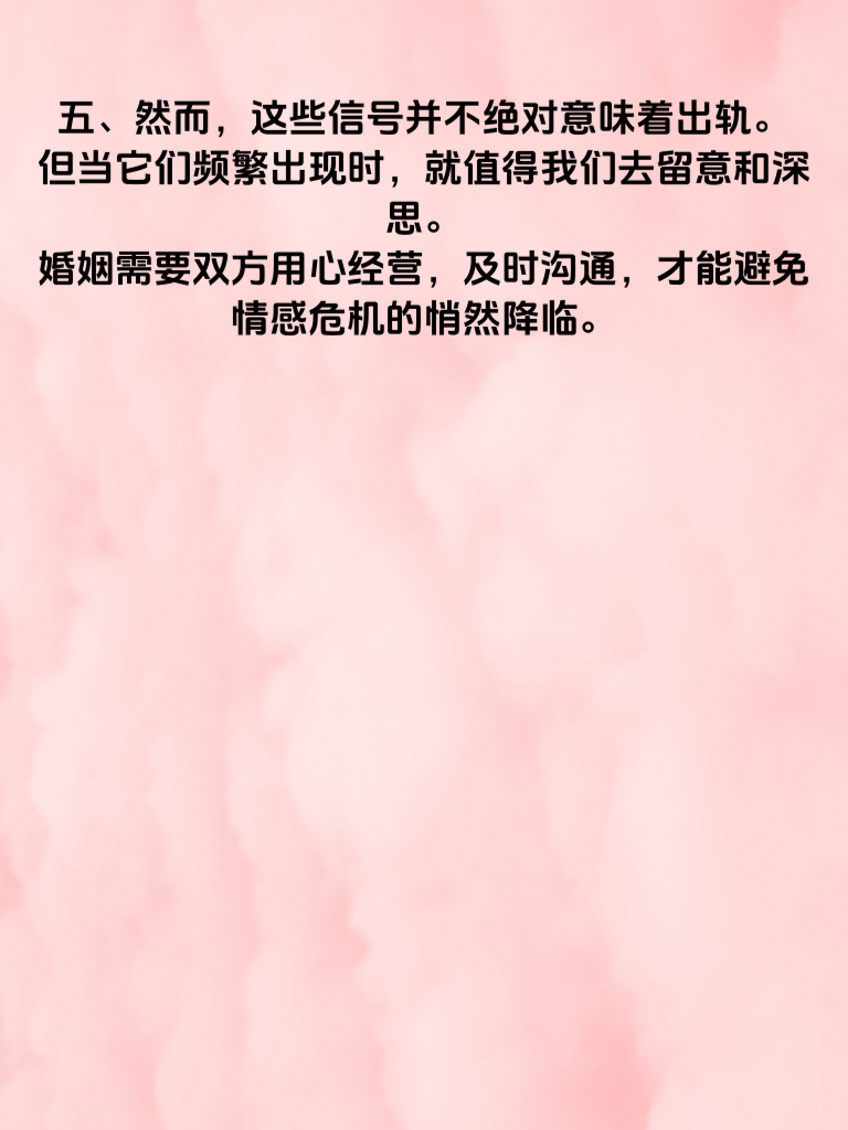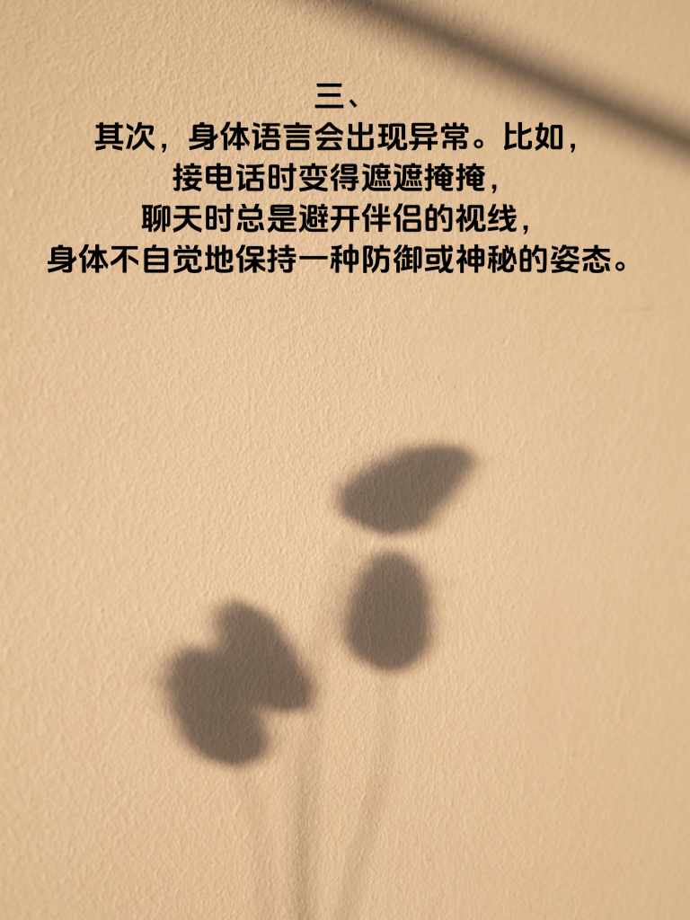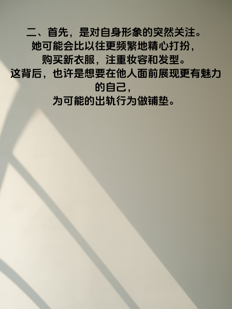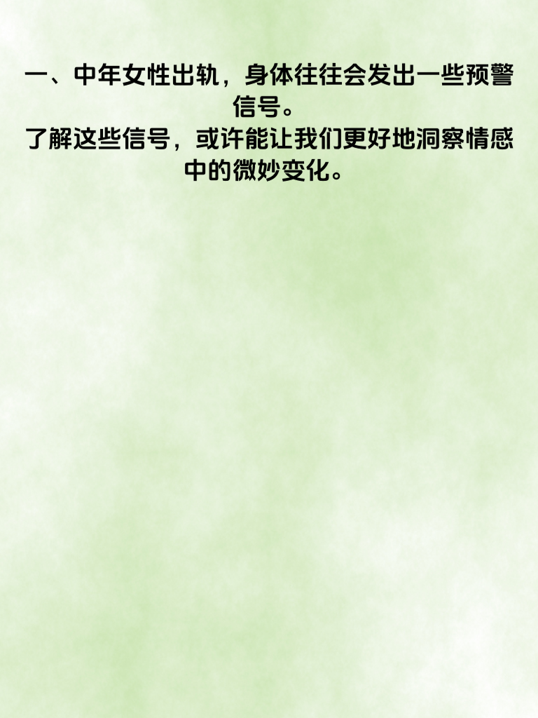 一、中年女性出轨,身体往往会发出一些预警信号。了解这些信号,或许能让我们更好地洞察情感中的微妙变化。 二、首先,是对自身形象的突然关注。她可能会比以往更频繁地精心打扮,购买新衣服,注重妆容和发型。这背后,也许是想要在他人面前展现更有魅力的自己,为可能的出轨行为做铺垫。 三、其次,身体语言会出现异常。比如,接电话时变得遮遮掩掩,聊天时总是避开伴侣的视线,身体不自觉地保持一种防御或神秘的姿态。 四、再者,生理上也可能有迹可循。她可能会突然睡眠质量变差,时而失眠,时而多梦。情绪波动也会比平时大,容易焦虑或莫名兴奋。 五、然而,这些信号并不绝对意味着出轨。但当它们频繁出现时,就值得我们去留意和深思。婚姻需要双方用心经营,及时沟通,才能避免情感危机的悄然降临。