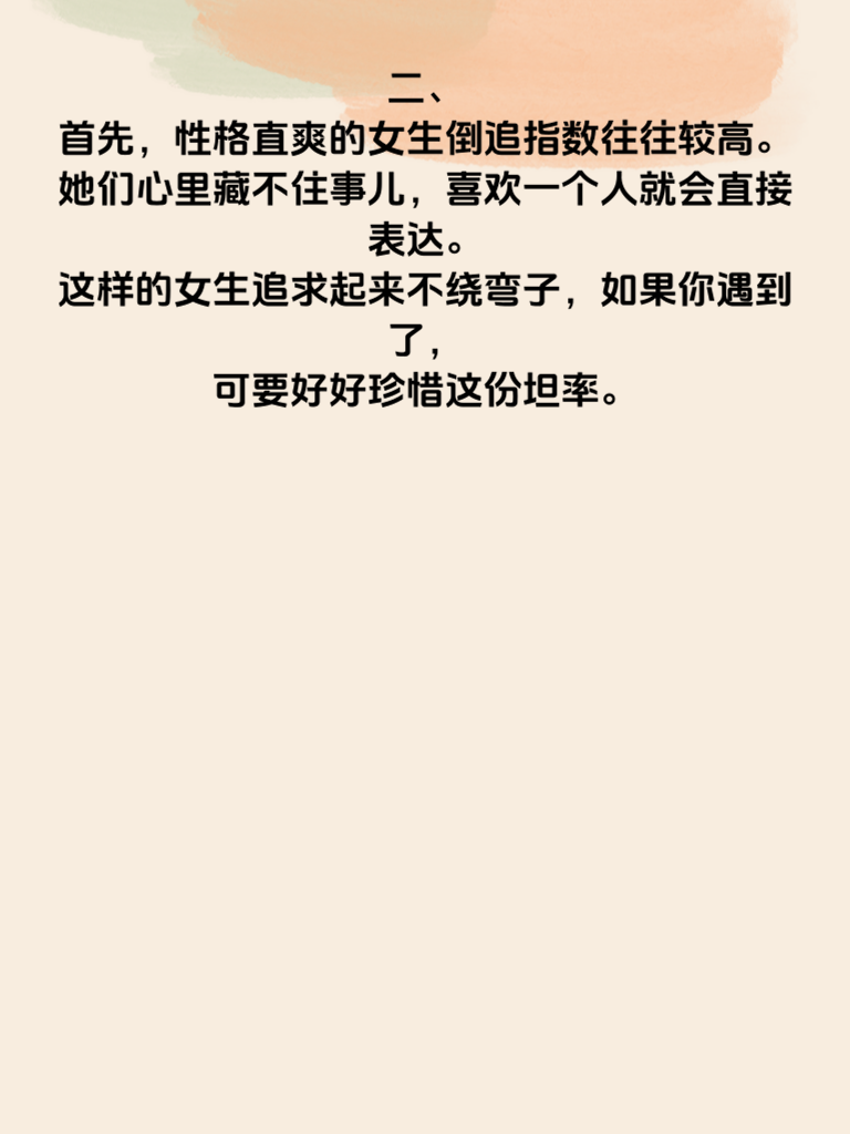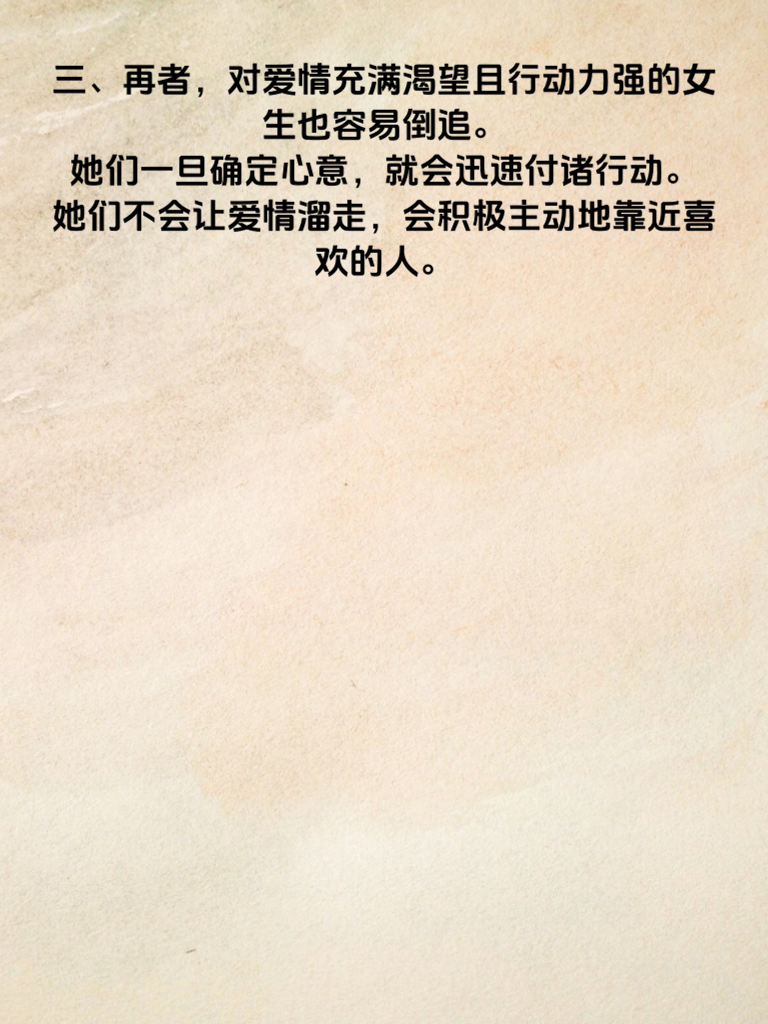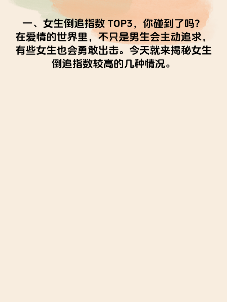 一、女生倒追指数TOP3,你碰到了吗?在爱情的世界里,不只是男生会主动追求,有些女生也会勇敢出击。今天就来揭秘女生倒追指数较高的几种情况。 二、首先,性格直爽的女生倒追指数往往较高。她们心里藏不住事儿,喜欢一个人就会直接表达。这样的女生追求起来不绕弯子,如果你遇到了,可要好好珍惜这份坦率。 三、再者,对爱情充满渴望且行动力强的女生也容易倒追。她们一旦确定心意,就会迅速付诸行动。她们不会让爱情溜走,会积极主动地靠近喜欢的人。 四、还有一种,就是有着明确爱情观的女生。她们清楚自己想要什么,遇到合适的人就会果断出手。她们的倒追往往带着坚定和执着,让人难以忽视。如果你碰到了这几种女生,那可要好好把握机会哦,说不定一段美好的爱情就在眼前。