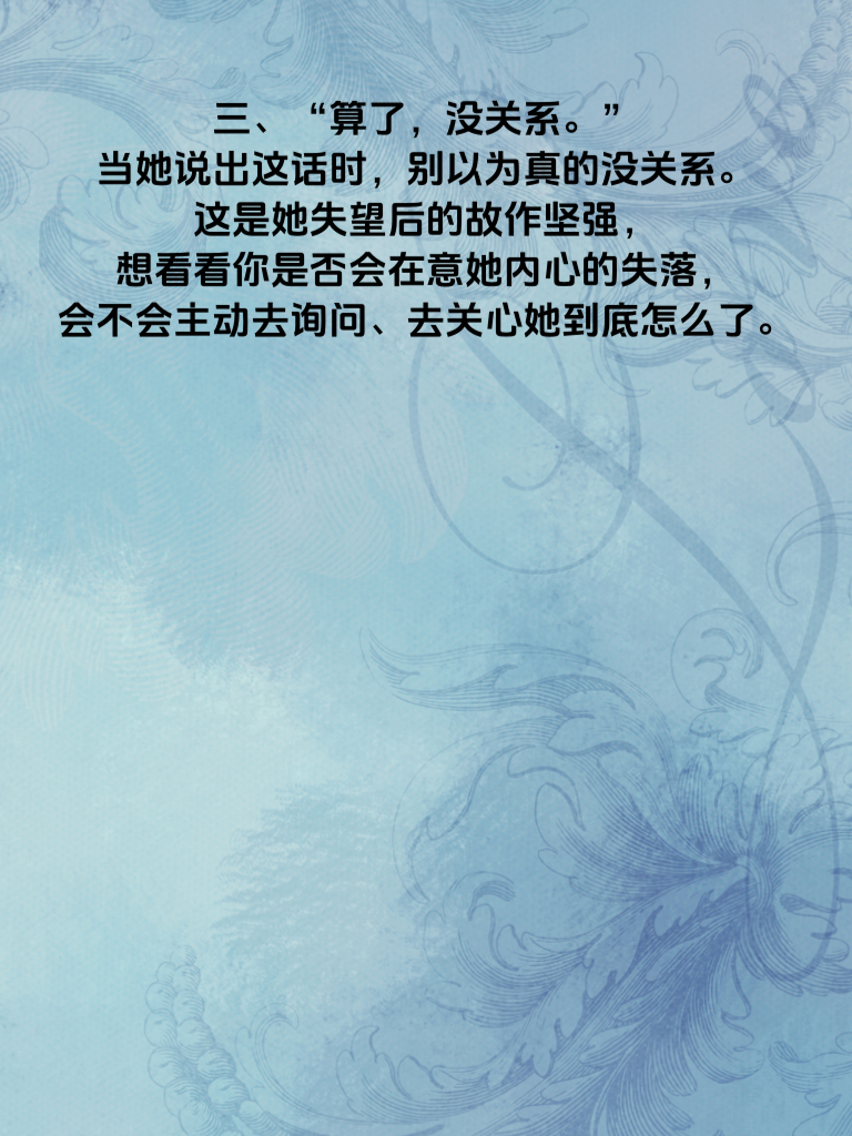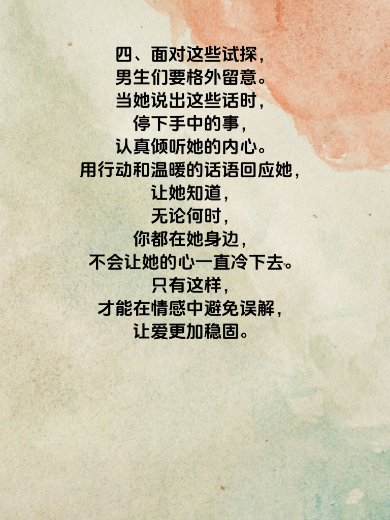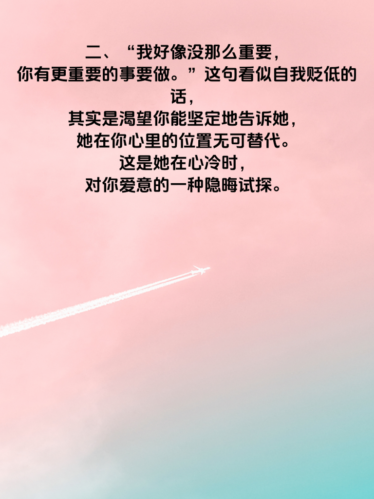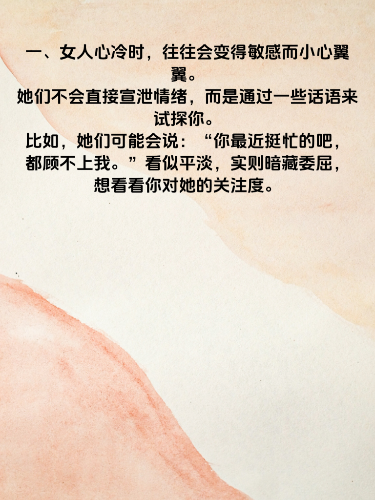 一、女人心冷时,往往会变得敏感而小心翼翼。她们不会直接宣泄情绪,而是通过一些话语来试探你。比如,她们可能会说:“你最近挺忙的吧,都顾不上我。”看似平淡,实则暗藏委屈,想看看你对她的关注度。 二、“我好像没那么重要,你有更重要的事要做。”这句看似自我贬低的话,其实是渴望你能坚定地告诉她,她在你心里的位置无可替代。这是她在心冷时,对你爱意的一种隐晦试探。 三、“算了,没关系。”当她说出这话时,别以为真的没关系。这是她失望后的故作坚强,想看看你是否会在意她内心的失落,会不会主动去询问、去关心她到底怎么了。 四、面对这些试探,男生们要格外留意。当她说出这些话时,停下手中的事,认真倾听她的内心。用行动和温暖的话语回应她,让她知道,无论何时,你都在她身边,不会让她的心一直冷下去。只有这样,才能在情感中避免误解,让爱更加稳固。