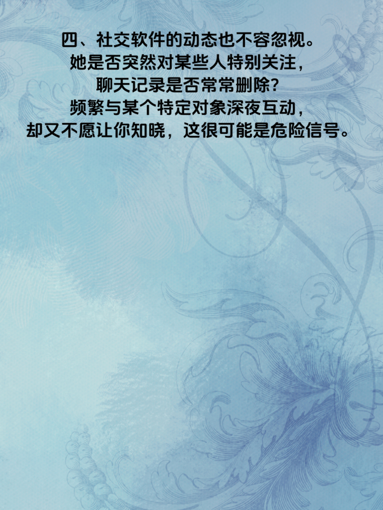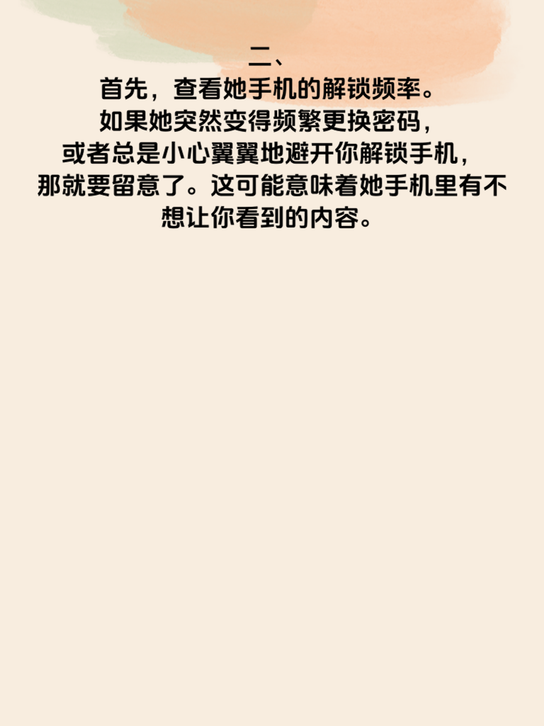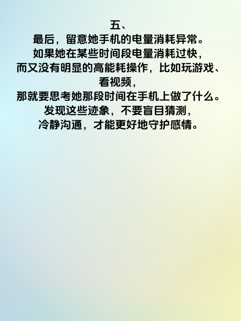 一、在情感的世界里,手机似乎成了窥探秘密的窗口。对于女性而言,手机有时藏匿着不为人知的秘密,甚至可能暗示着出轨的迹象。 二、首先,查看她手机的解锁频率。如果她突然变得频繁更换密码,或者总是小心翼翼地避开你解锁手机,那就要留意了。这可能意味着她手机里有不想让你看到的内容。 三、再者,关注她对手机的态度。她是否总是机不离身,甚至在你面前也不让手机离开视线?接电话时是否会刻意走远,遮遮掩掩?这些细节背后或许藏着猫腻。 四、社交软件的动态也不容忽视。她是否突然对某些人特别关注,聊天记录是否常常删除?频繁与某个特定对象深夜互动,却又不愿让你知晓,这很可能是危险信号。 五、最后,留意她手机的电量消耗异常。如果她在某些时间段电量消耗过快,而又没有明显的高能耗操作,比如玩游戏、看视频,那就要思考她那段时间在手机上做了什么。发现这些迹象,不要盲目猜测,冷静沟通,才能更好地守护感情。