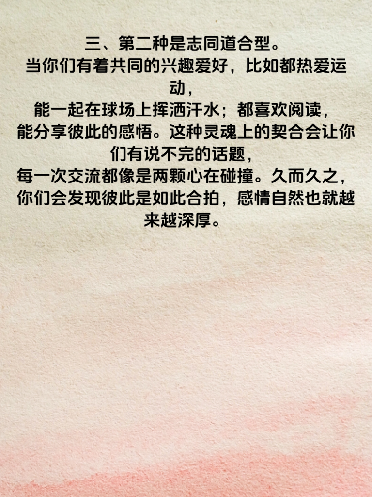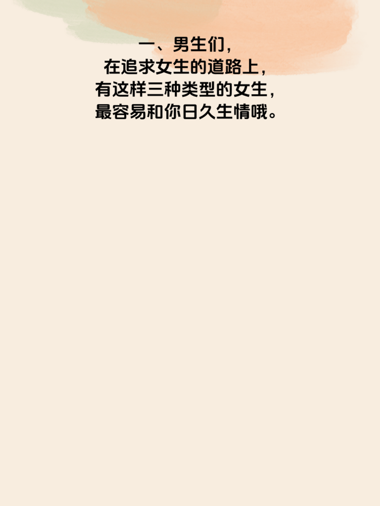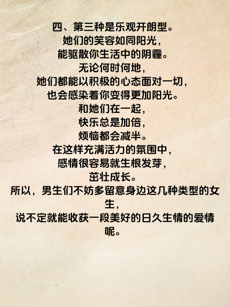 一、男生们,在追求女生的道路上,有这样三种类型的女生,最容易和你日久生情哦。 二、第一种是温柔体贴型。她们总是能轻声细语地和你交流,在你疲惫时给予温暖的安慰,在你遇到困难时耐心地倾听并给出贴心的建议。她们的温柔就像春风,轻轻拂过你的心田,让你不知不觉就深陷其中。和这样的女生相处,每一天都会充满温馨,感情也会在点滴中慢慢升温。 三、第二种是志同道合型。当你们有着共同的兴趣爱好,比如都热爱运动,能一起在球场上挥洒汗水;都喜欢阅读,能分享彼此的感悟。这种灵魂上的契合会让你们有说不完的话题,每一次交流都像是两颗心在碰撞。久而久之,你们会发现彼此是如此合拍,感情自然也就越来越深厚。 四、第三种是乐观开朗型。她们的笑容如同阳光,能驱散你生活中的阴霾。无论何时何地,她们都能以积极的心态面对一切,也会感染着你变得更加阳光。和她们在一起,快乐总是加倍,烦恼都会减半。在这样充满活力的氛围中,感情很容易就生根发芽,茁壮成长。所以,男生们不妨多留意身边这几种类型的女生,说不定就能收获一段美好的日久生情的爱情呢。