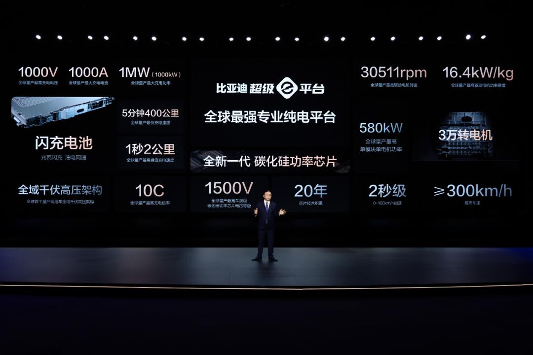 2025年3月17日,比亚迪发布超级e平台,推出全球量产最快充电系统。该平台搭载的"闪充电池"通过1000V高压与1000A超大电流技术,实现1兆瓦(1000kW)充电功率,创下"1秒2公里"的充电速度,仅需5分钟即可补充400公里续航,真正达到与燃油车加油相当的"油电同速"体验。汉L、唐L作为首搭车型同步开启预售,EV版价格27-36万。