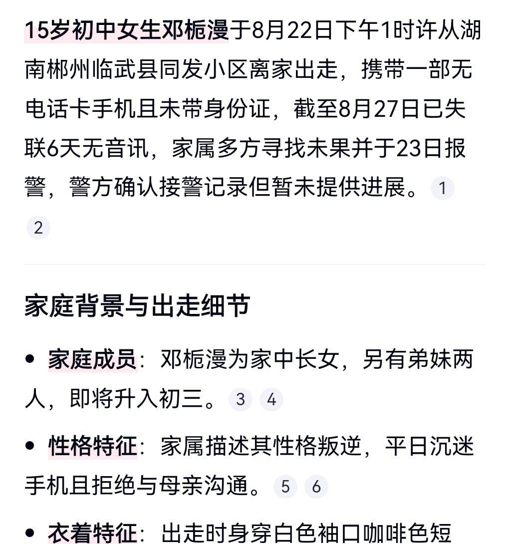 这真的是太令人担心了。 8月27日有媒体报道。 15岁初中女生离家出走6天无音讯