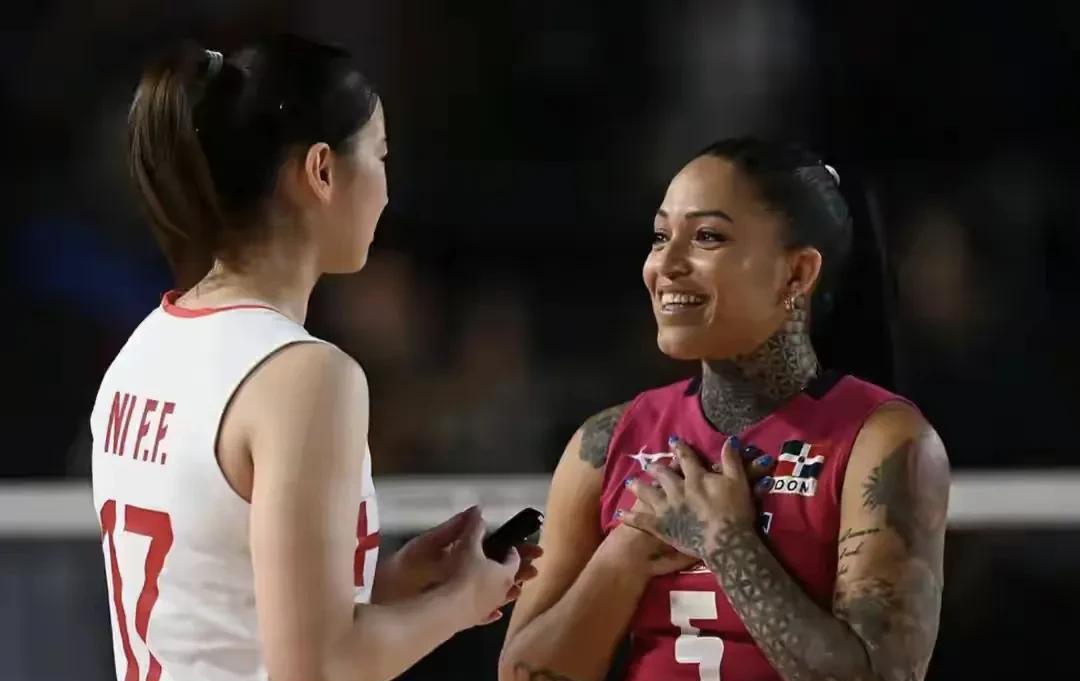 中国女排在世锦赛小组赛收官战3-0完胜多米尼加女排,将她们“推给”了巴西女排,赛后,两队队员亲切交流,气氛融洽,倪非凡与多米尼加队的世界著名自由人卡斯蒂略打招呼,王媛媛与曾在天津打球的前队友塔皮亚合影留念。